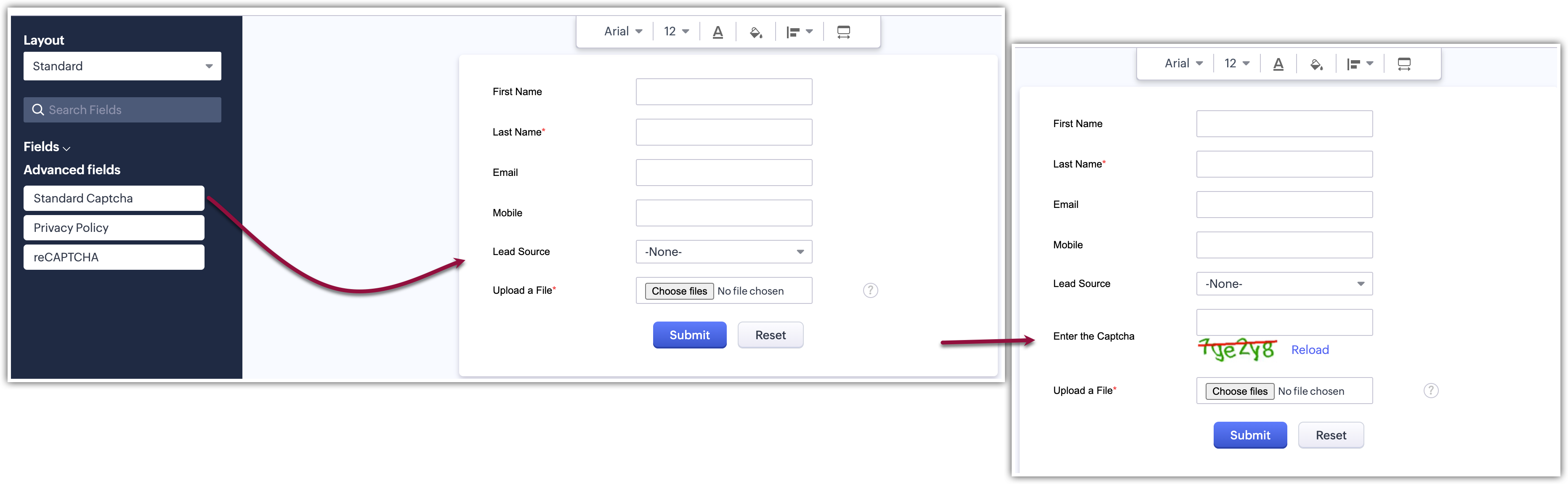 | Inserează Captcha standard | Captcha este folosit pentru securitate în formularele de feedback, înregistrarea pe site-uri, comentariile vizitatorilor, etc. Adaugă captcha pentru sistemul Zoho CRM pentru a preveni programele automate neautorizate de spam să completeze formularul web. Această opțiune este disponibilă doar în edițiile plătite. |