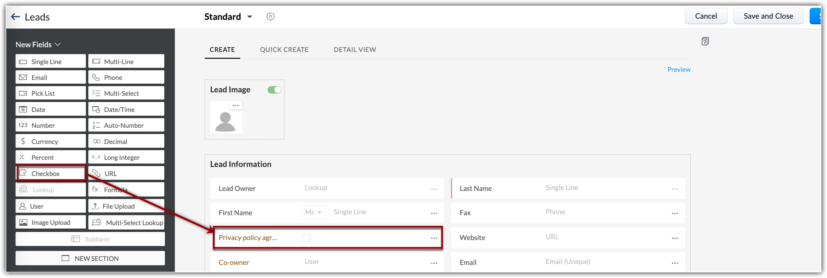 - Din New Fields Tray din stânga, trage și plasează tipul de câmp casetă de bifat în secțiunea dorită a modulului din dreapta.