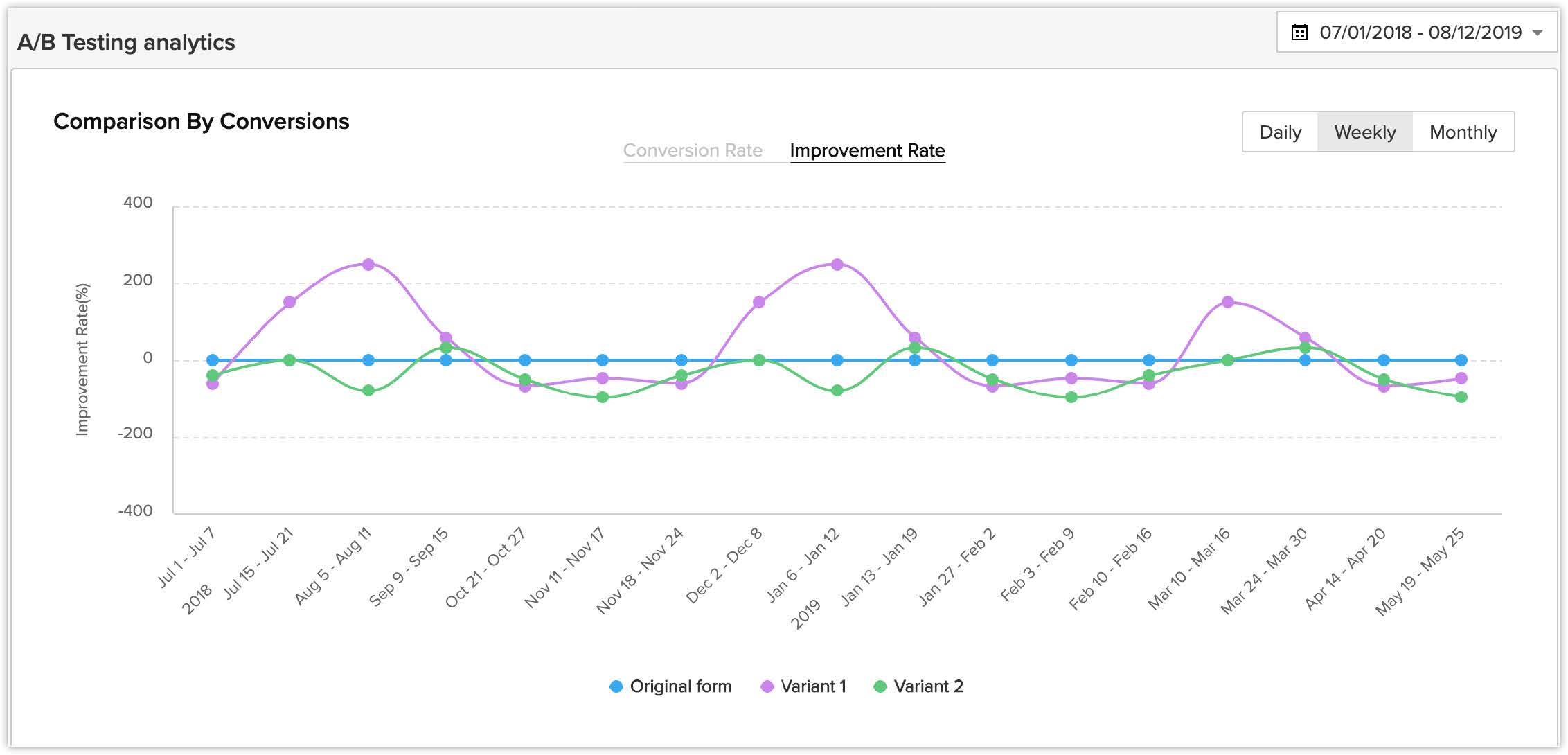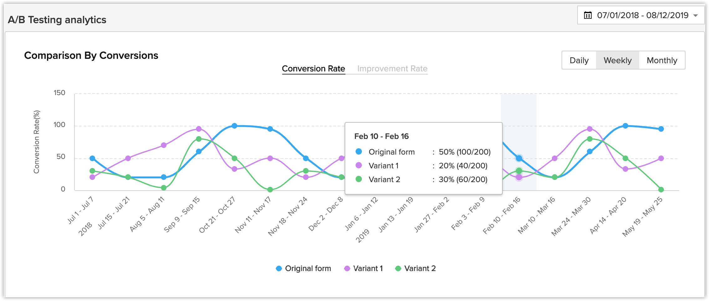 Acest grafic afișează o comparație a ratei de conversie și a ratei de îmbunătățire între formularul original și fiecare dintre variante.