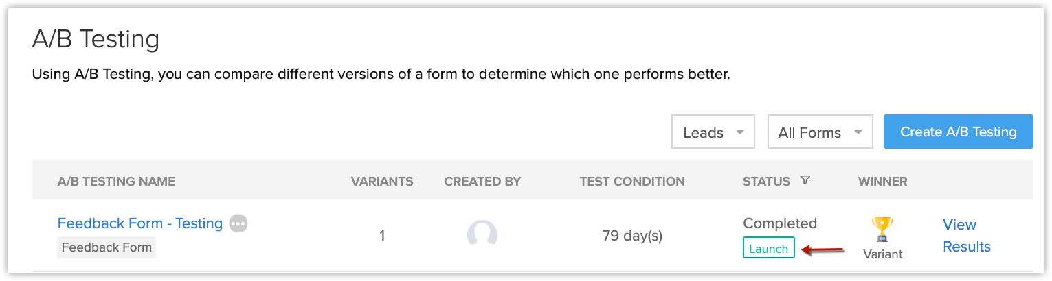 Odată ce testarea A/B este finalizată, poți vizualiza statusul și statisticile privind performanța formularului original și a variantelor. - Lansează câștigătorul