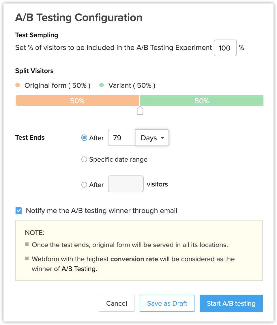 Configurarea testării A/B implică definirea procentului de vizitatori care ar trebui incluși în testarea A/B. Mai departe, trebuie specificat și procentul de vizitatori care ar trebui să vadă webformularul original și variantele. Data și ora sau numărul de vizitatori după care testarea A/B ar trebui să se încheie determină durata testării A/B. Poți salva și configurația testării A/B ca ciornă.