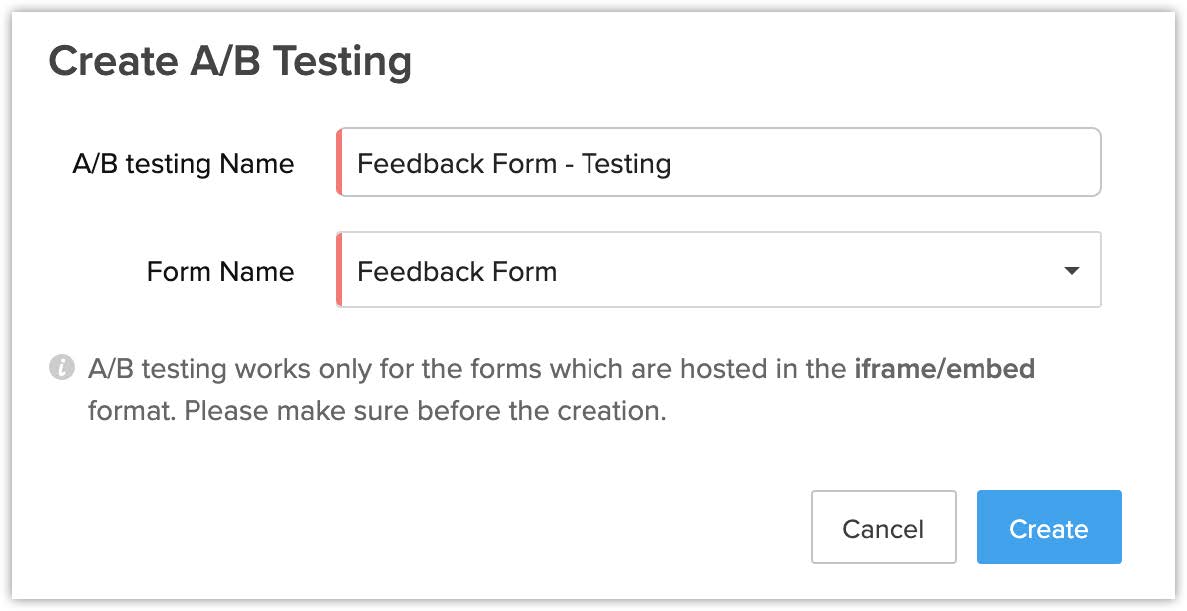 - Testarea A/B este suportată doar pentru integrarea manuală în cazul formularelor CRM folosite în Zoho Sites. Nu este suportată pentru formularele care au fost integrate ca elemente.