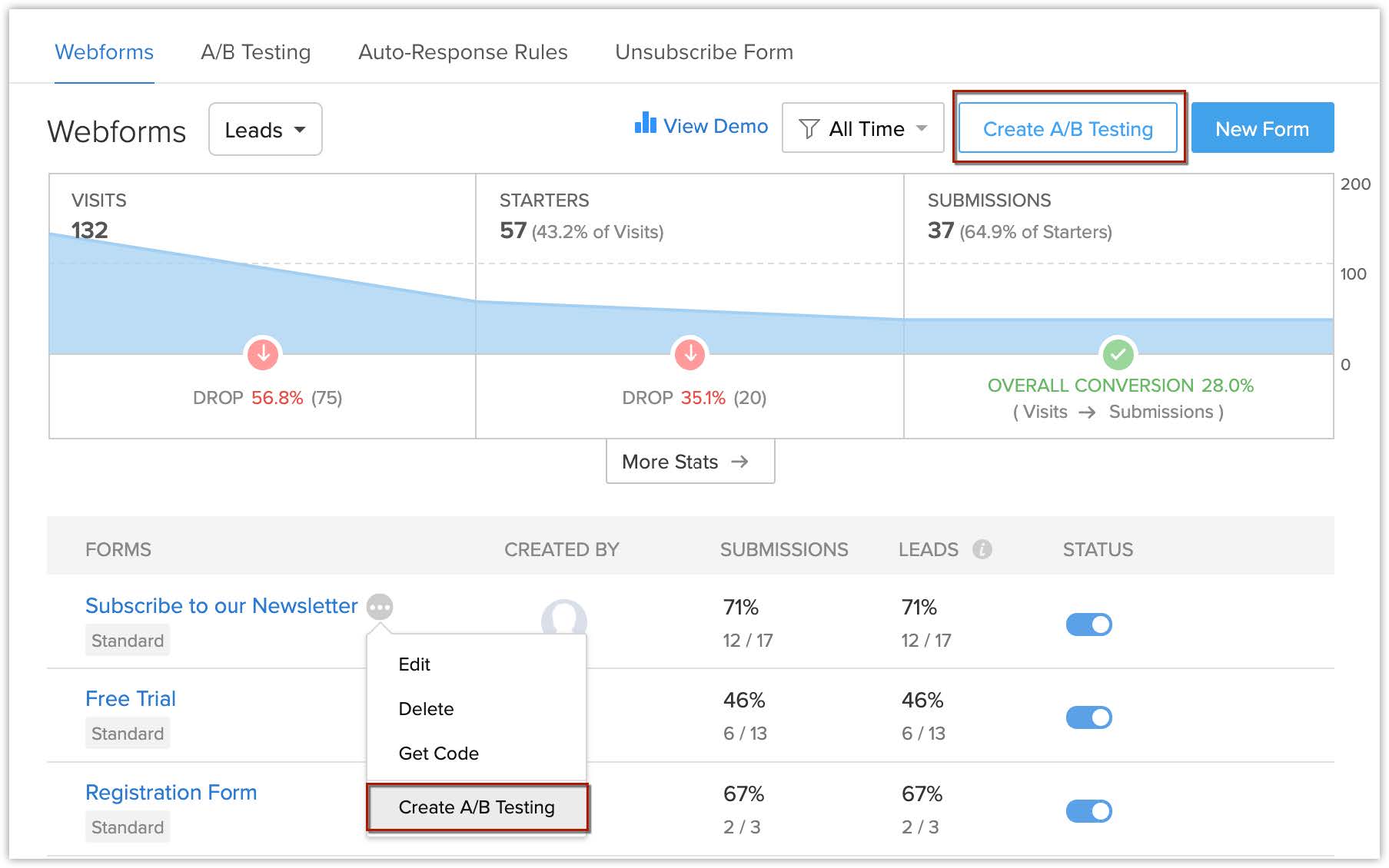 Poți crea și un test A/B făcând clic pe butonul Create A/B Testing din pagina Webforms sau plasând cursorul mouse-ului peste un webformular în tab-ul Webforms și făcând clic pe More apoi pe Create A/B Testing.