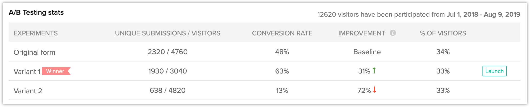 Odată ce testul A/B este finalizat și câștigătorul este declarat, poți lansa webformularul câștigător pe site-ul tău care va înlocui formularul original. Câștigătorul este declarat pe baza ratei de conversie, adică numărul total de vizite versus numărul total de trimiteri unice făcute de vizitatori. Poți lansa fie manual, fie automat după ce perioada de testare A/B este finalizată.