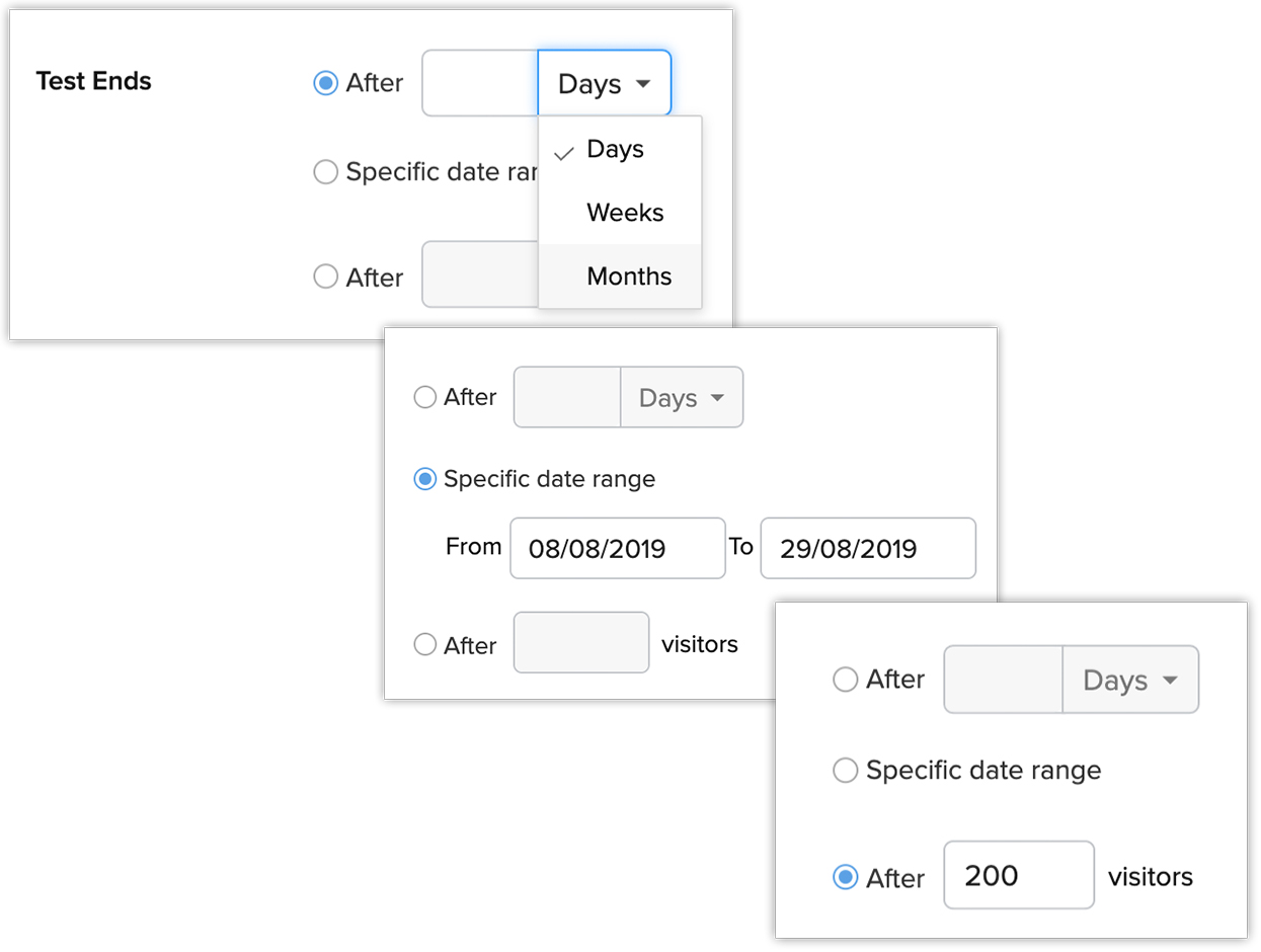 - Se încheie după ce limita de vizitatori este atinsă. De exemplu, după ce 350 de vizitatori au vizualizat webformularul, testarea A/B poate fi finalizată.