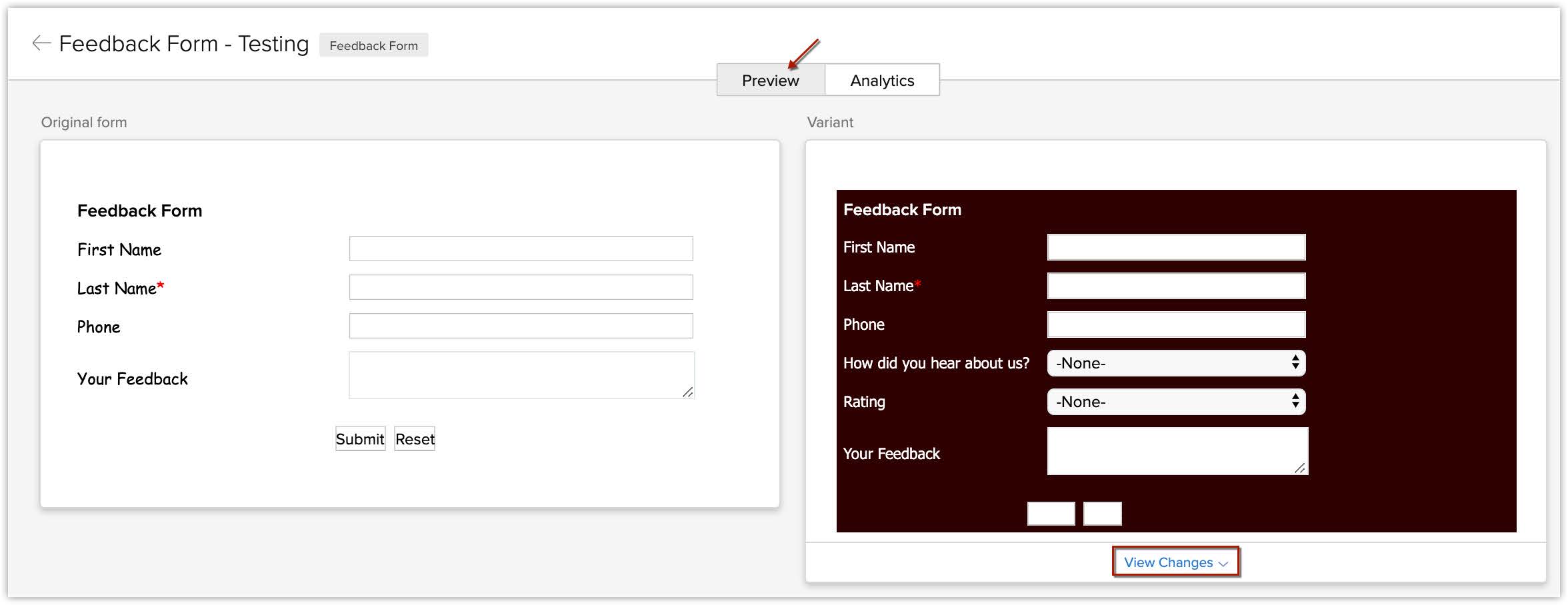 Tab-ul Previzualizare afișează formularul original și variantele pe care le-ai creat pentru testare. Poți previzualiza variantele formularului pe ecran complet făcând clic pe iconița Expanded View (). De asemenea, poți vedea modificările făcute variantelor comparativ cu formularul original.