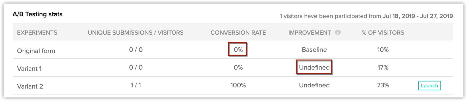 - Dacă rata de conversie este 0 pentru formularul original, nu va fi definită nicio valoare de îmbunătățire pentru variante.