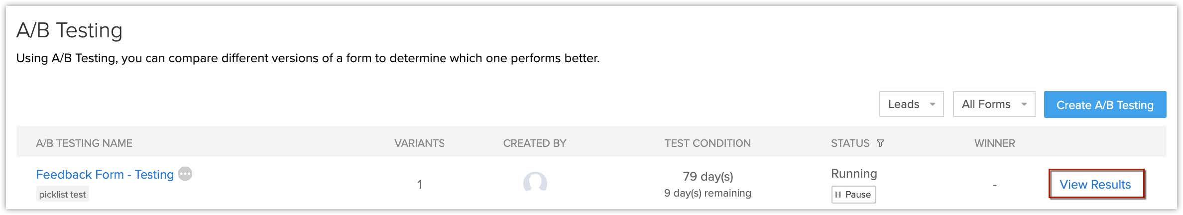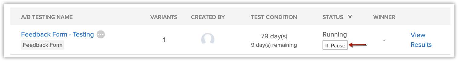 Dacă pui temporar pe pauză testarea A/B, formularul web original va fi afișat tuturor vizitatorilor în timp ce este pe pauză. Când testul este reluat, variantele vor fi afișate din nou.