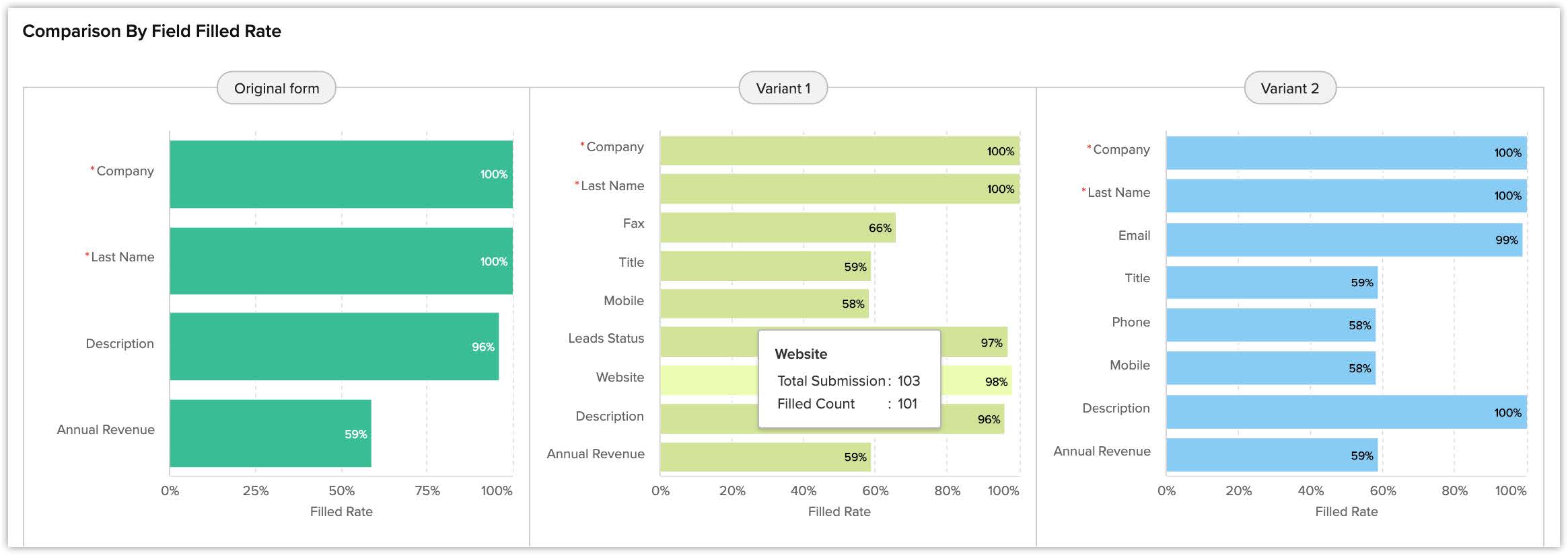 Acest grafic afișează rata cu care câmpurile din webformularul original și variante au fost completate.