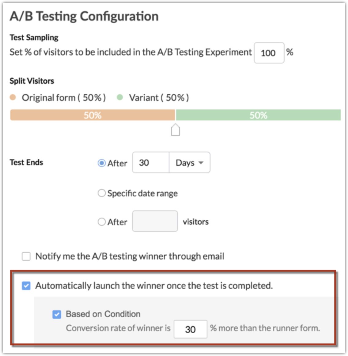 - Bifează caseta pentru a trimite o notificare prin email despre care formular câștigă testul A/B.