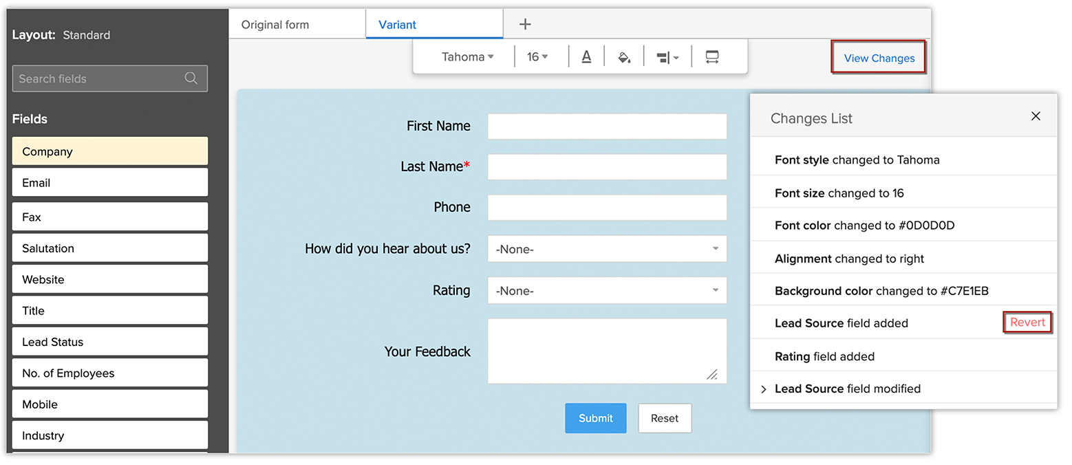 Poți crea versiuni diferite ale webformularului original prin includerea mai multor câmpuri, modificarea proprietăților câmpurilor, schimbarea butoanelor Call To Action, schimbarea fonturilor, revizuirea culorii de fundal a formularului și așa mai departe. Toate modificările pe care le faci în variantă pot fi vizualizate din Lista de modificări. De asemenea, poți reveni asupra modificărilor, dacă este necesar.