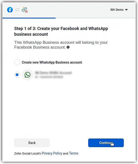 - Creează un cont WhatsApp Business nou sau selectează conturi existente din opțiuni.