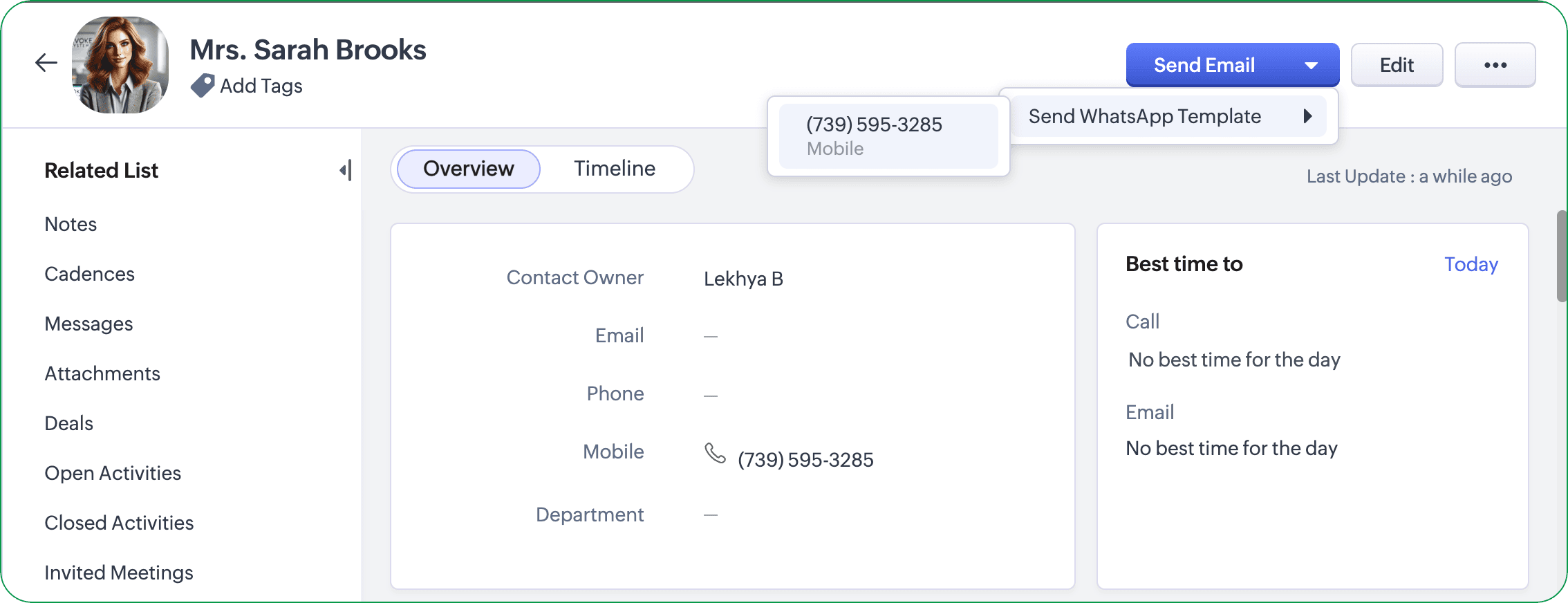 - Apasă pe dropdown-ul de lângă butonul Send Email > Send WhatsApp Template. Selectează numărul de la care dorești să trimiți mesajul.