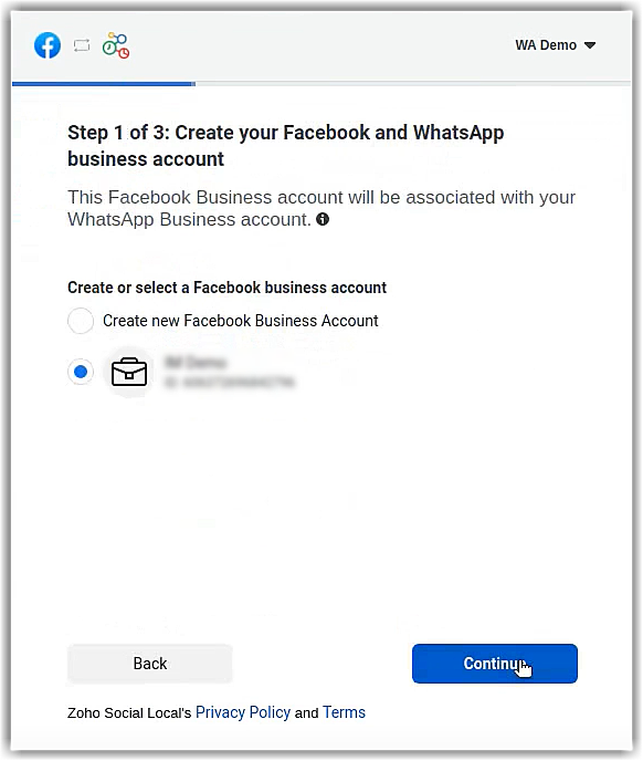 - Creează un cont Facebook Business nou sau selectează un cont existent din opțiuni.