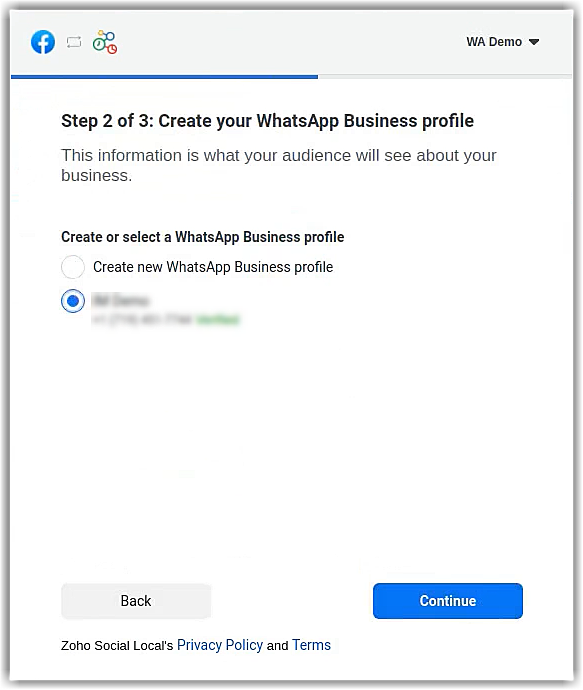 Creează un profil WhatsApp Business nou sau selectează un profil existent din opțiuni.