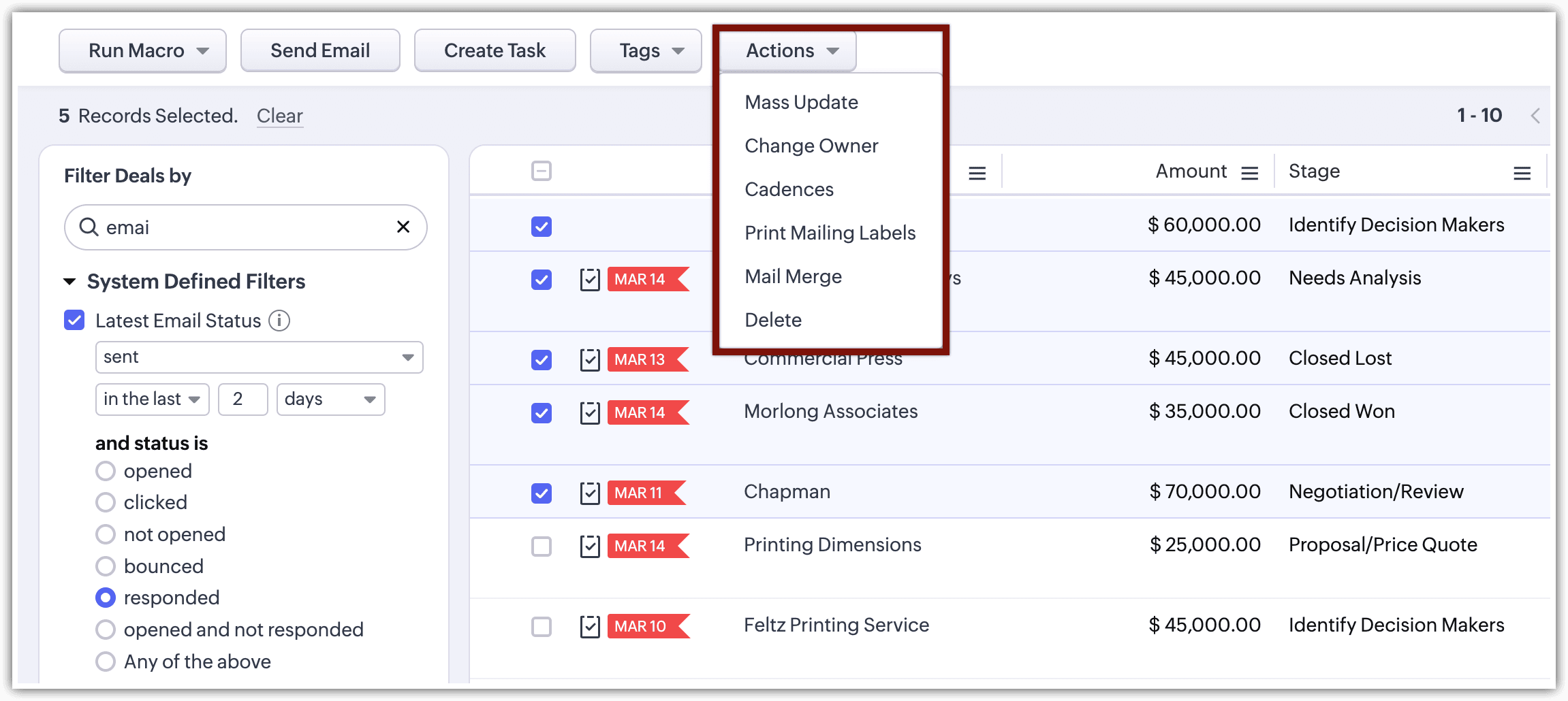 Poți aplica acțiuni instant pe înregistrările filtrate folosind filtrele avansate, cum ar fi Mass Update, Mass Email, Macros și altele.
