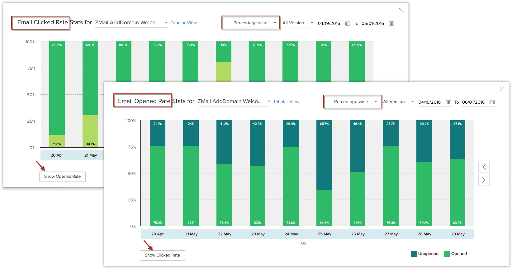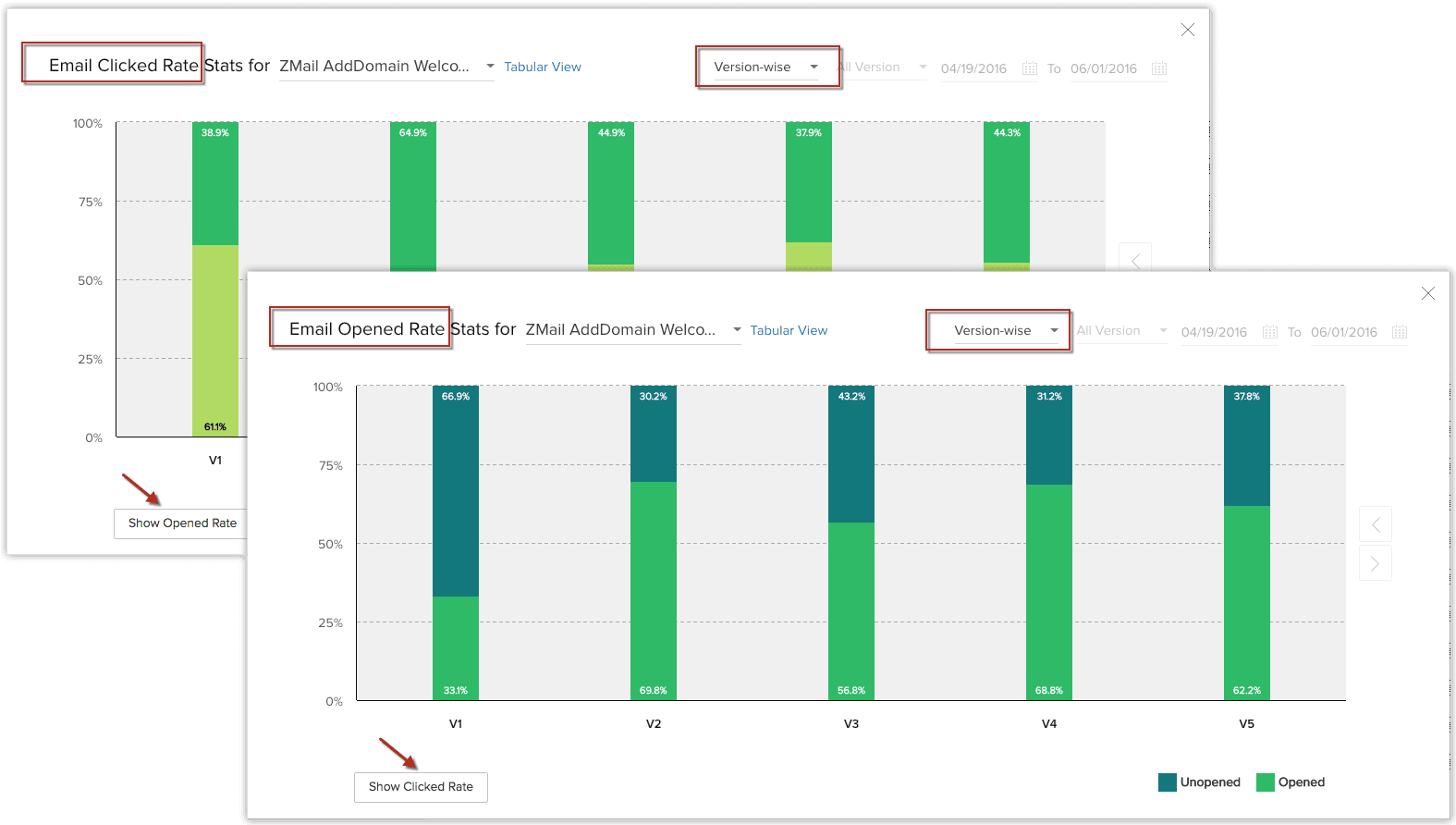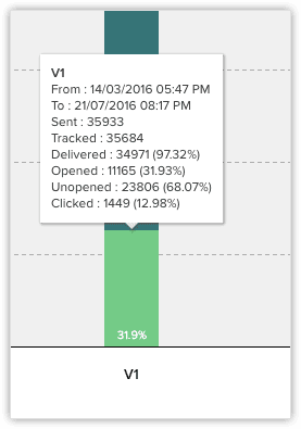 Pe lângă faptul că poți vedea ratele de deschidere/nedeschidere ale unui șablon, poți aprofunda și vedea cât de mult au afectat performanța modificările minore sau majore ale șablonului. După fiecare modificare, o nouă "versiune" a șablonului va fi creată, iar fiecare versiune va avea propriile statistici.