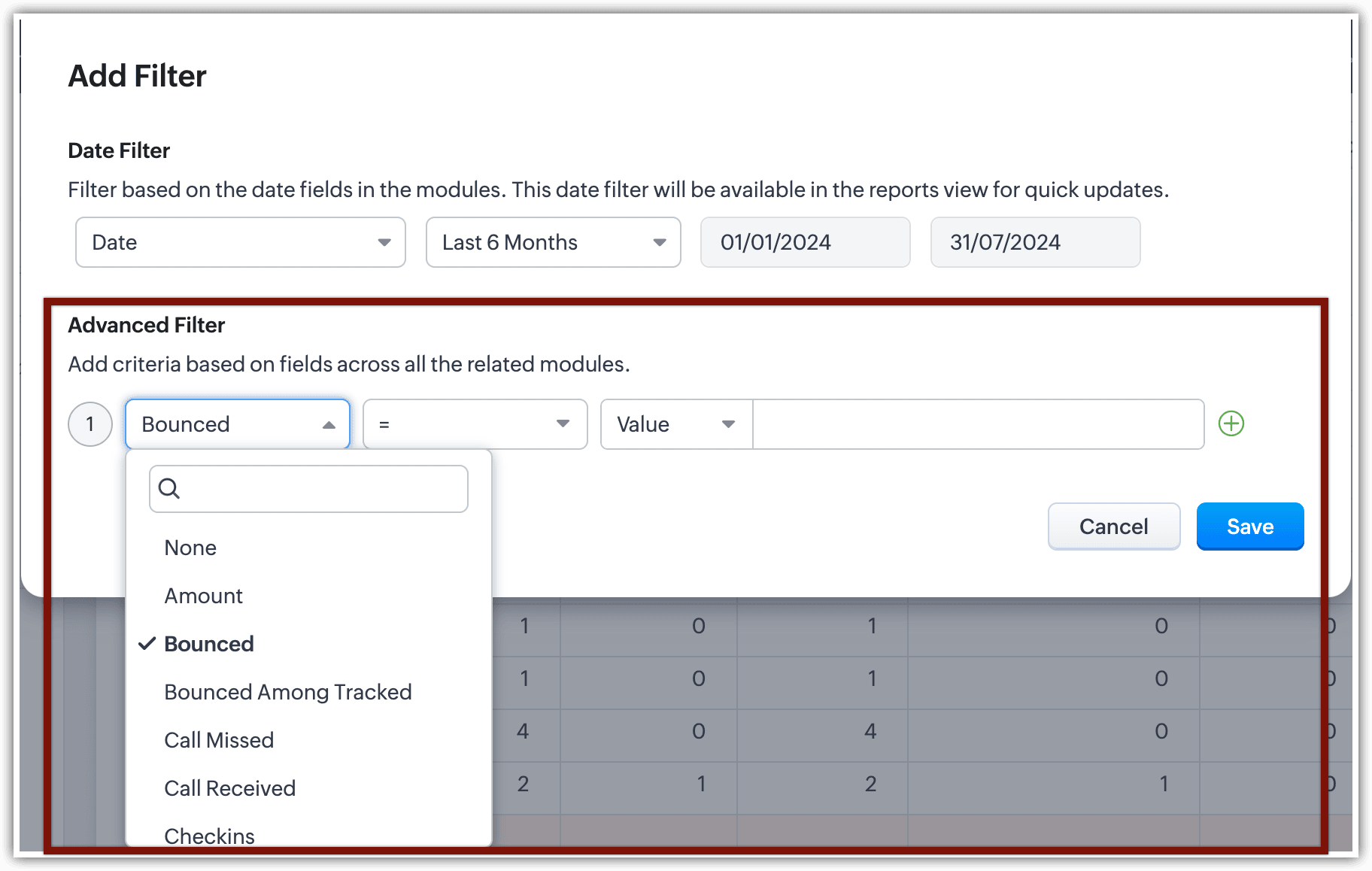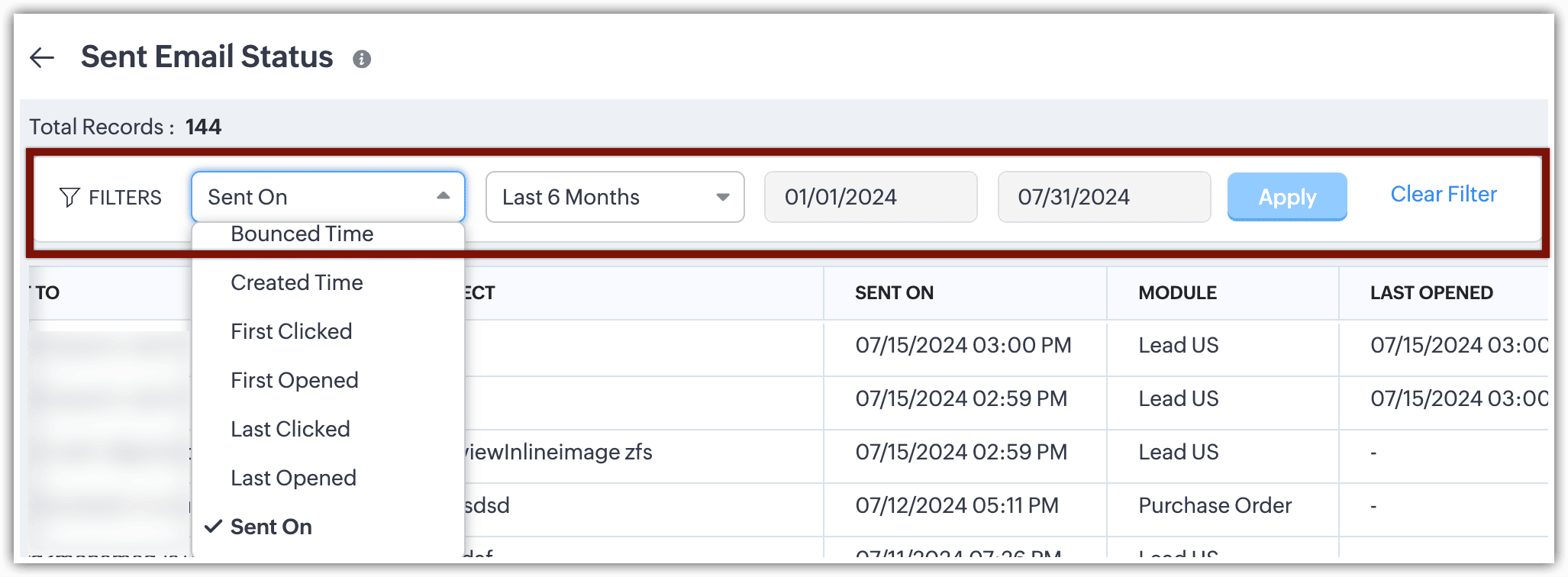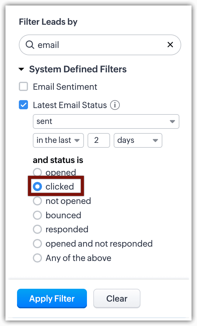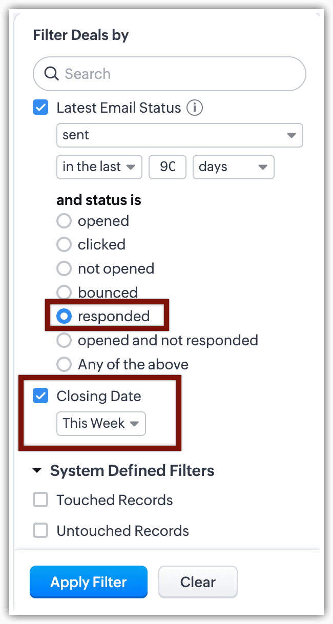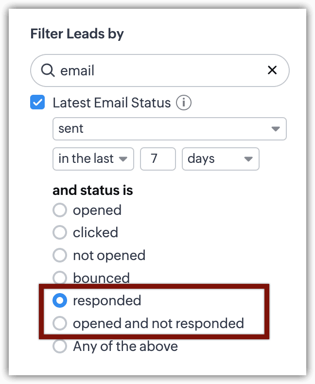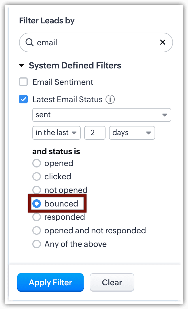 În acest fel, filtrele avansate deschid porțile pentru descoperiri când vine vorba de datele tale CRM. Cu Statusul Emailului printre criteriile de căutare, căutarea devine și mai bună.