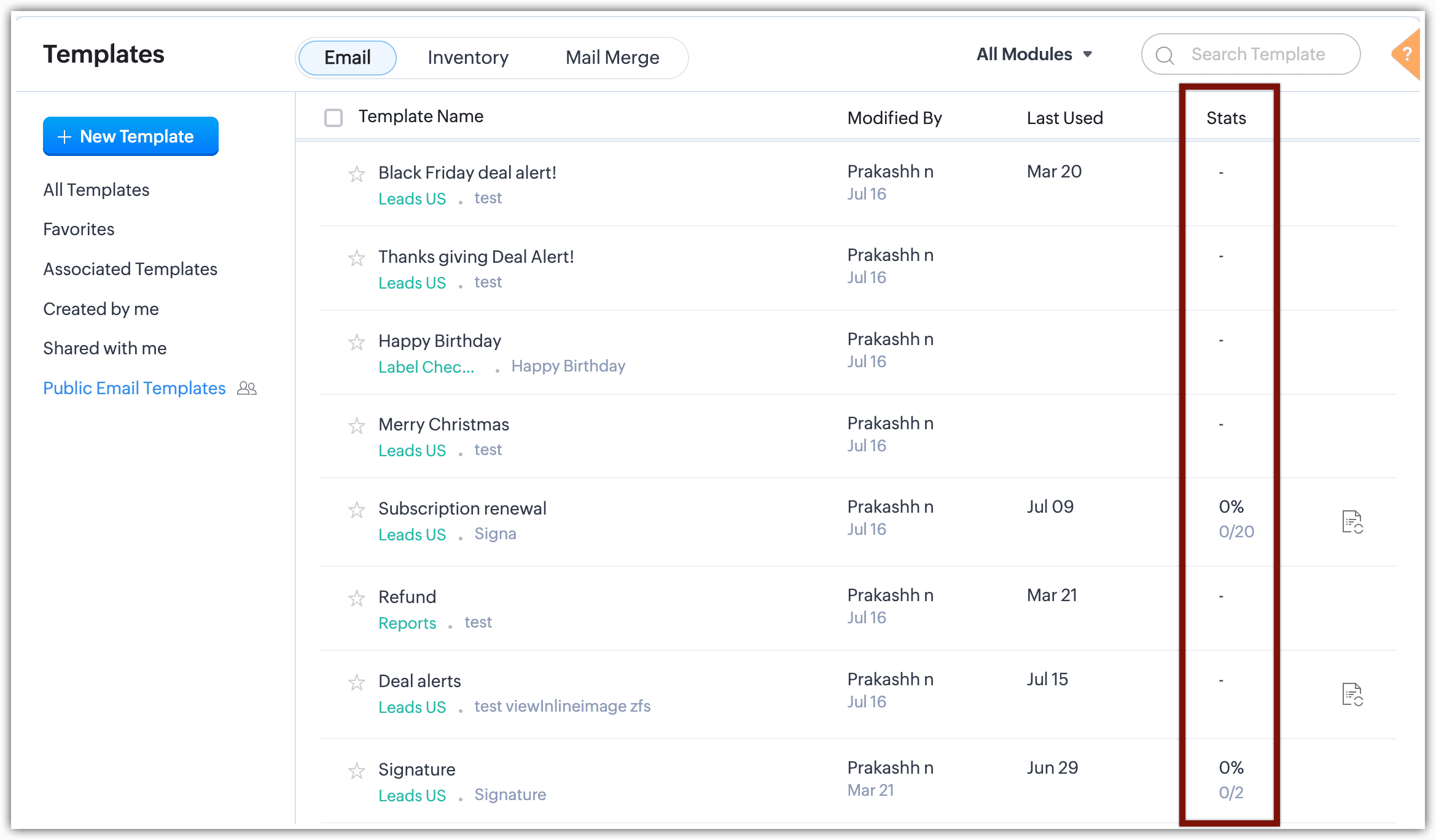 - Statisticile șablonului pot fi accesate și când alegi un șablon de email pentru a fi trimis în următoarele zone din Zoho CRM: