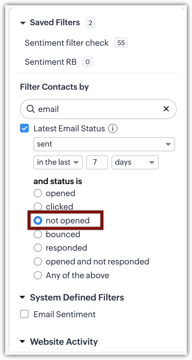 Cu Email Insights activat pentru contul tău, Statusul Emailului este printre prioritățile pe baza cărora poți efectua căutarea. De exemplu, folosind filtre avansate, poți căuta "contacte care au deschis emailuri în ultimele 3 zile". Sau "contacte cărora li s-au trimis emailuri dar nu le-au deschis săptămâna aceasta."