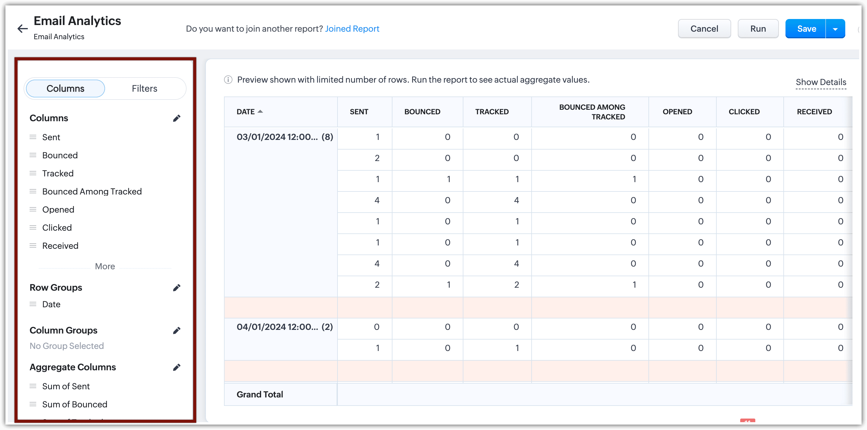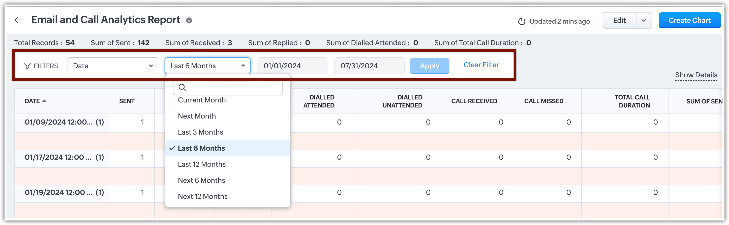 Notă: Acest raport nu va lista emailurile trimise din Gmail, Zoho Mail și altele, deoarece aceste emailuri nu pot fi urmărite de Zoho CRM.