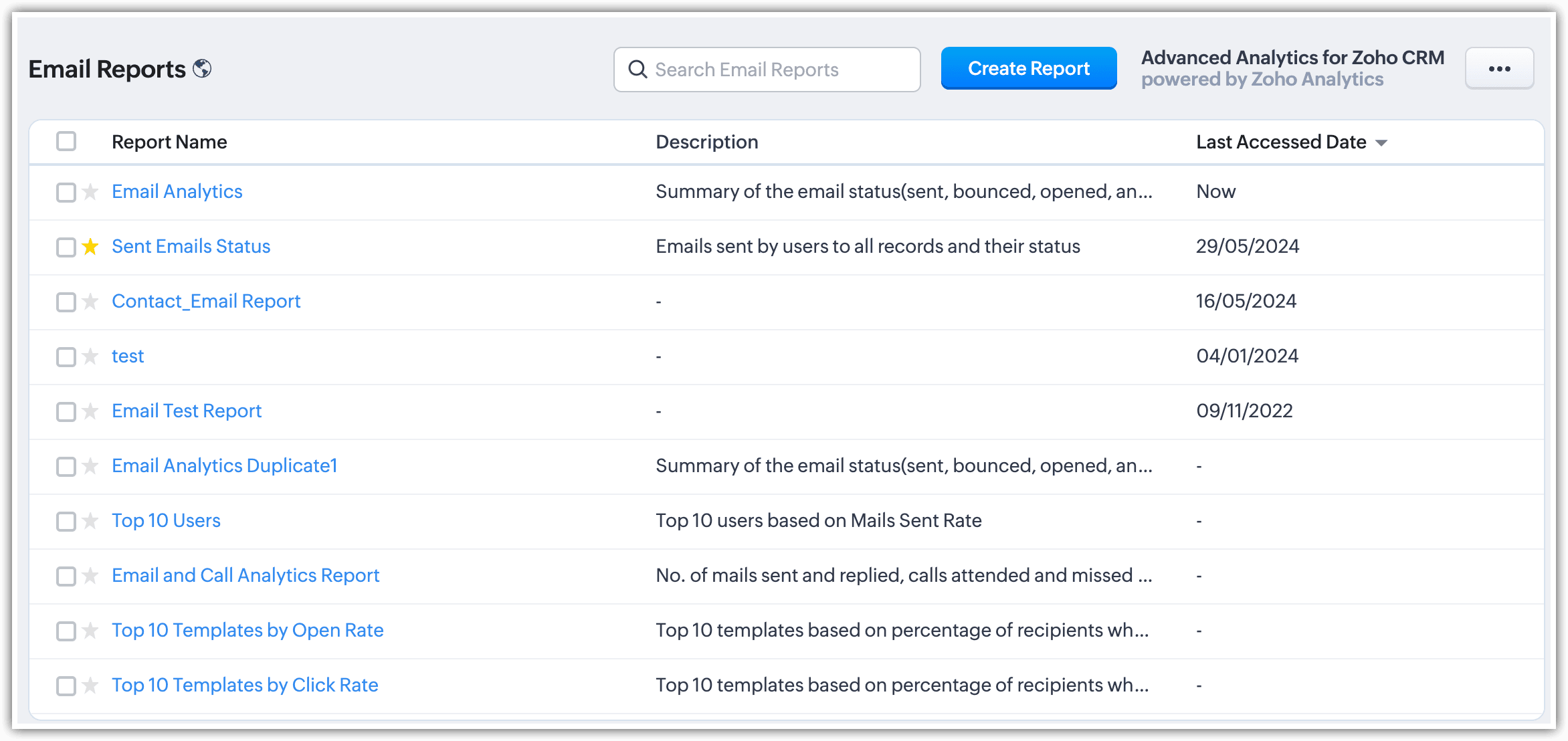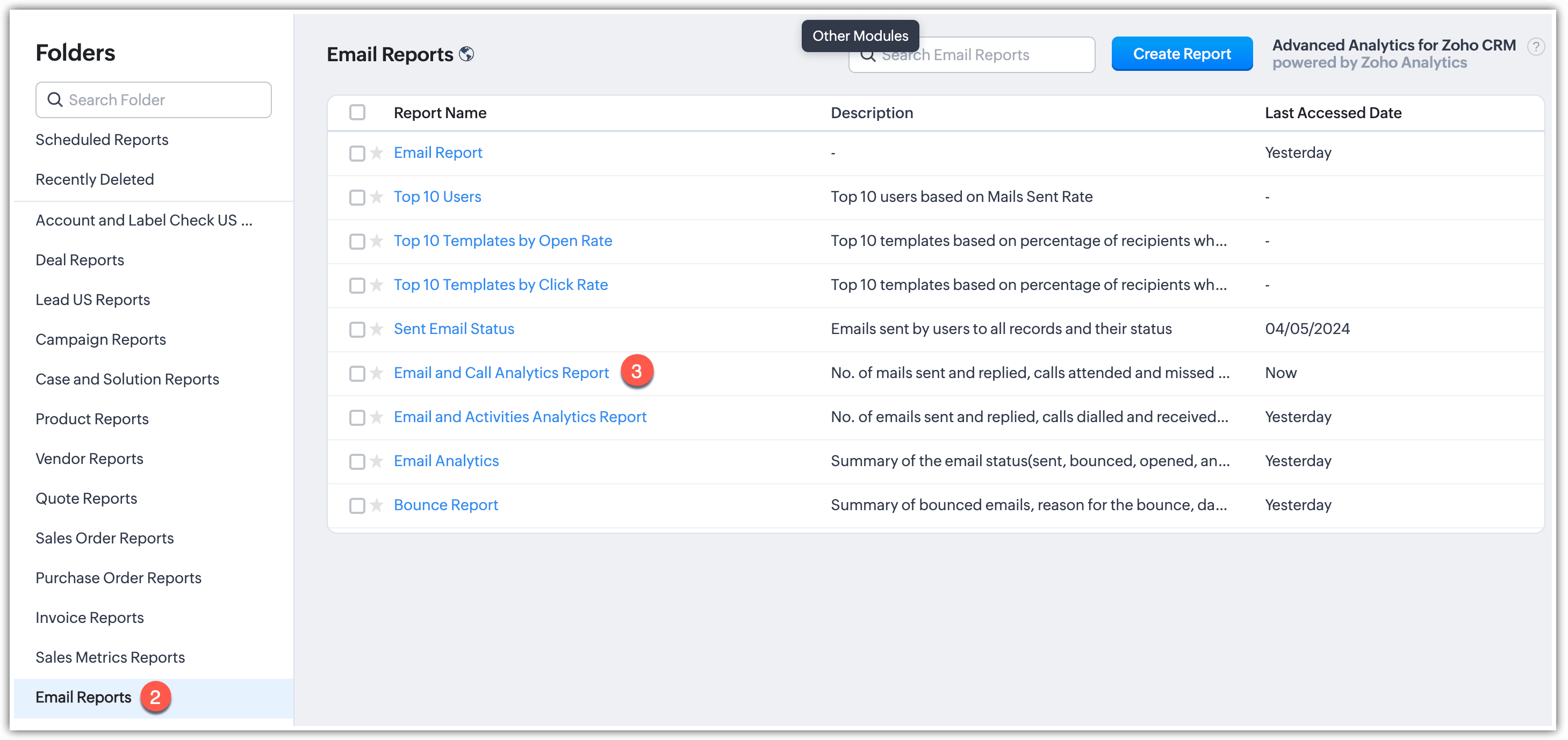 Odată ce ai activat Email Insights în contul tău Zoho CRM, vei avea acces la următoarele rapoarte de email: