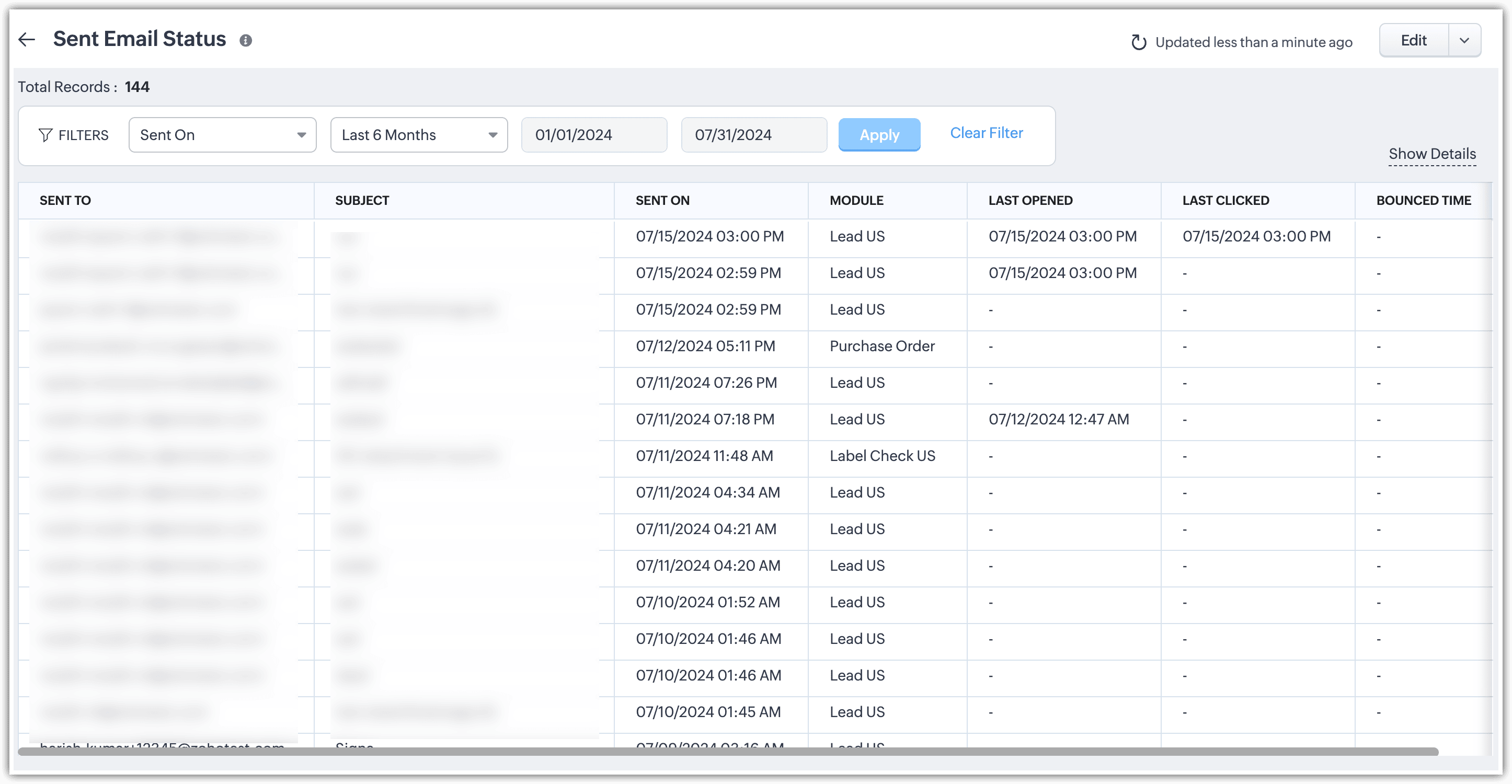 Raportul Sent Email Status îți va arăta lista emailurilor trimise prin Zoho CRM.
