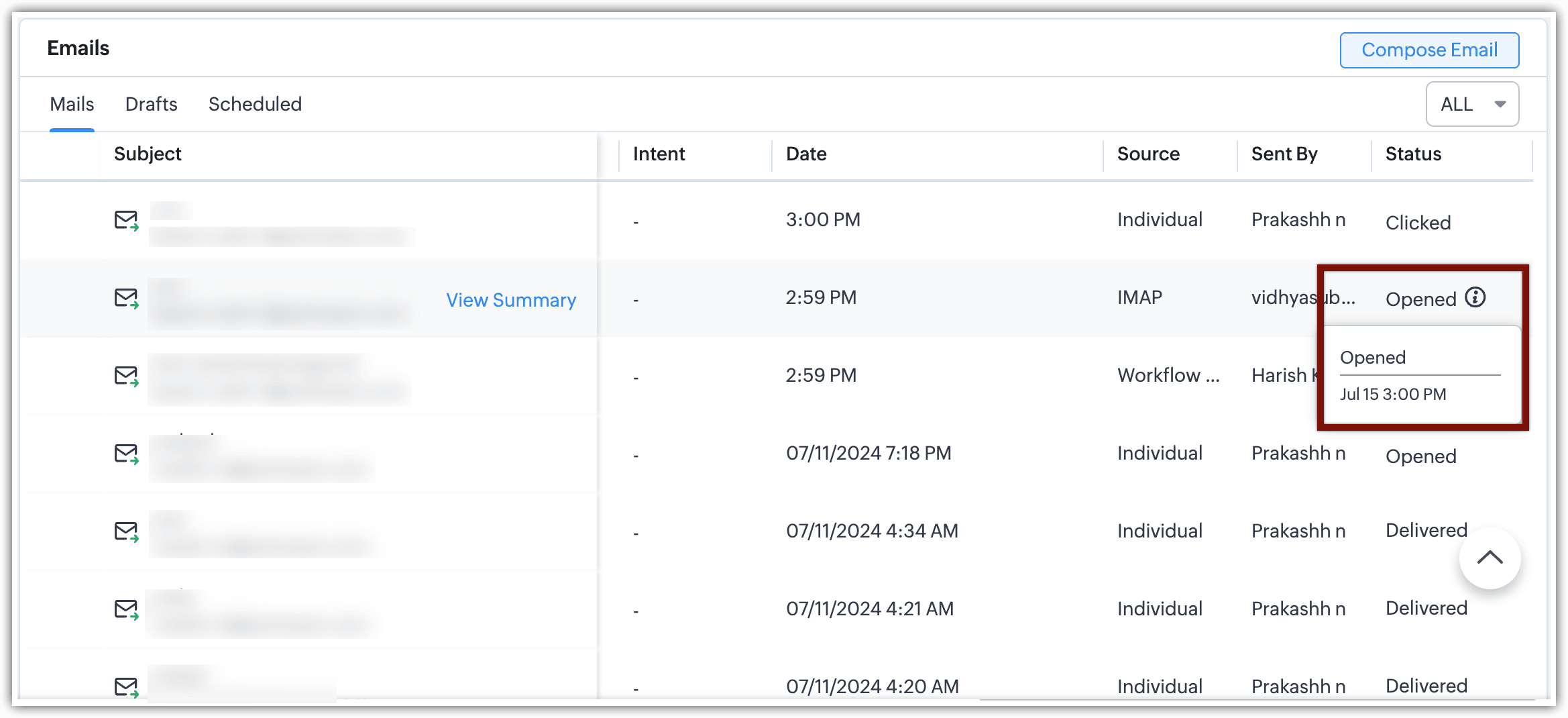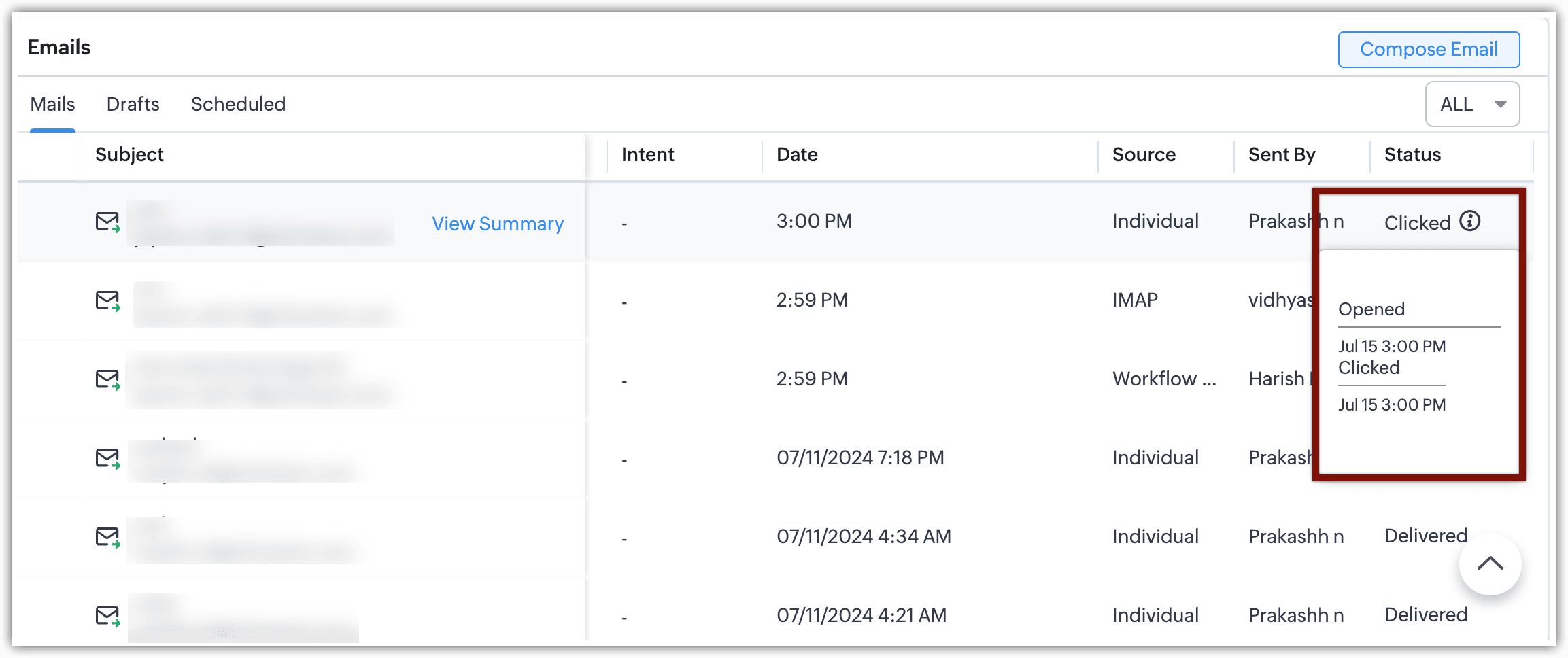 Detaliile despre modul în care un client interacționează cu emailurile tale sunt disponibile în contextul interacțiunilor lor specifice. Poți vizualiza statusul emailurilor individuale în secțiunea Emails din cadrul fiecărei înregistrări Lead, Contact sau Deal.