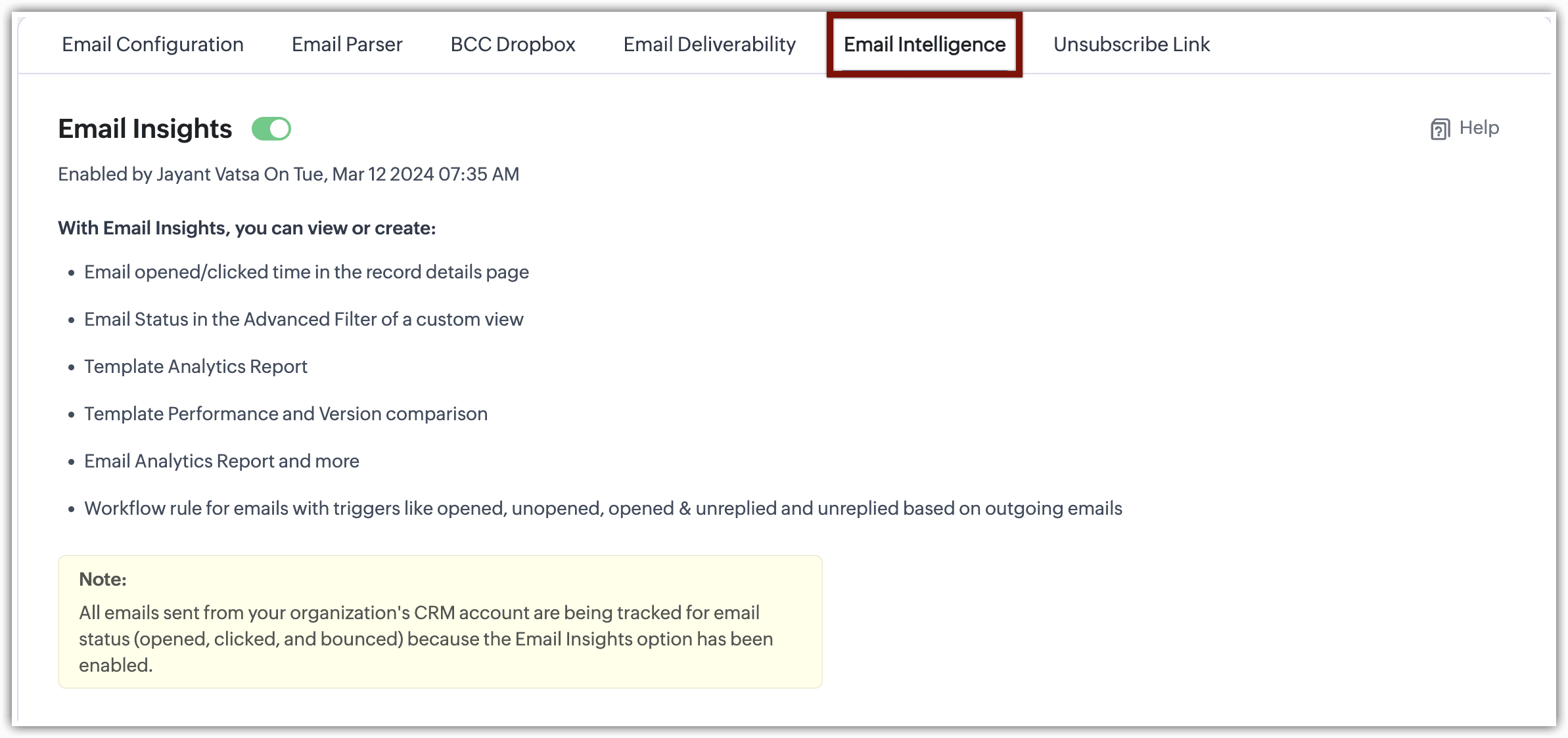 - Email Insights este activat implicit într-un cont CRM.