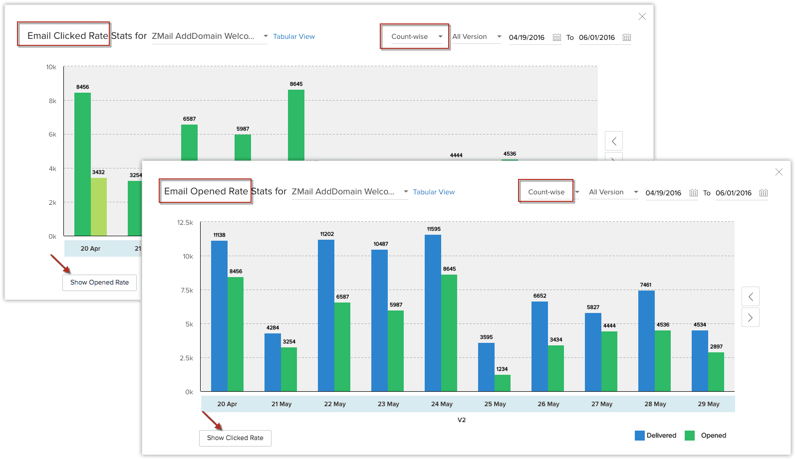 Cu toate acestea, emailurile trimise prin configurare IMAP (Zoho Mail sau Gmail etc) nu vor fi urmărite. - Bounced: Totalul emailurilor care nu au putut fi livrate.