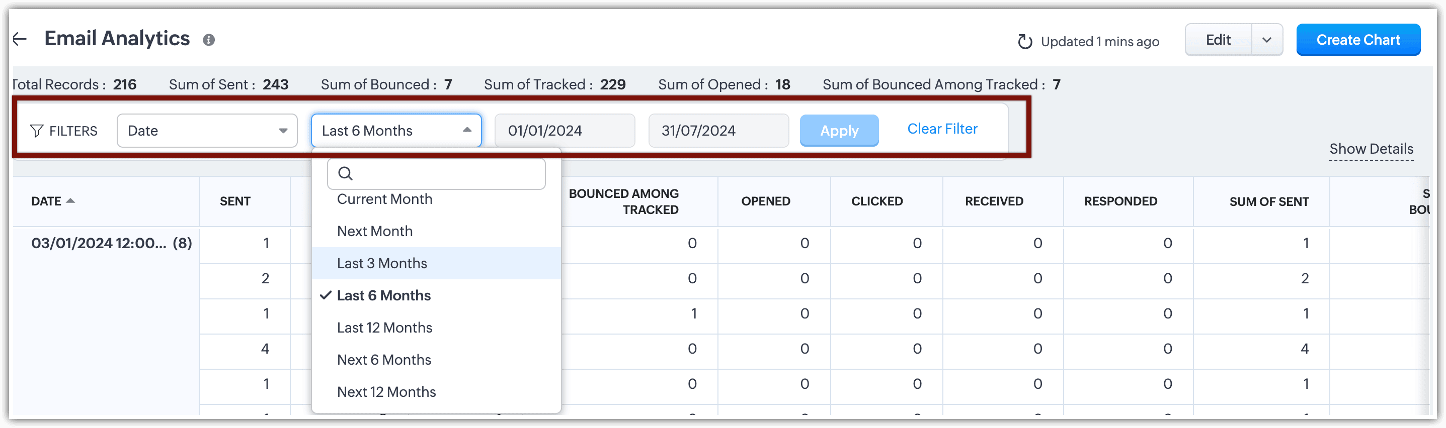 - Selectând butonul de editare pentru a adăuga sau elimina coloane și a aplica filtre, vei putea vizualiza întreaga statistică de email filtrată pe baza condițiilor pe care le-ai specificat pentru rapoarte, folosind același buton de editare.