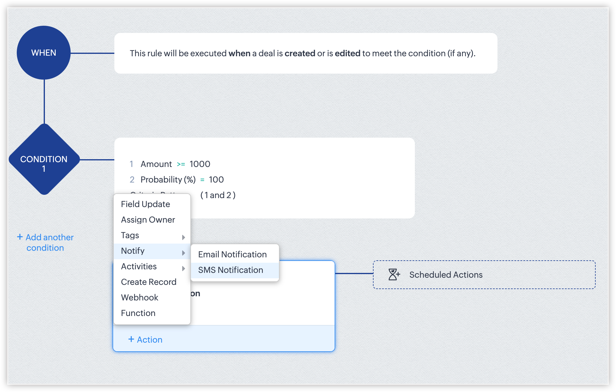După configurarea SMS de notificare pentru CRM-ul tău, utilizatorii pot automatiza SMS-urile de notificare folosind o combinație de reguli Workflow, Blueprint și parcursuri CommandCenter. În regulile Workflow, utilizatorii pot configura tranzacția workflow, condiția și pot alege SMS Notification ca acțiune instantanee pentru a trimite mesaje SMS conform regulilor stabilite. În Blueprint, pentru orice tranziție After, SMS Notification va fi disponibil pentru a-i automatiza acțiunea.