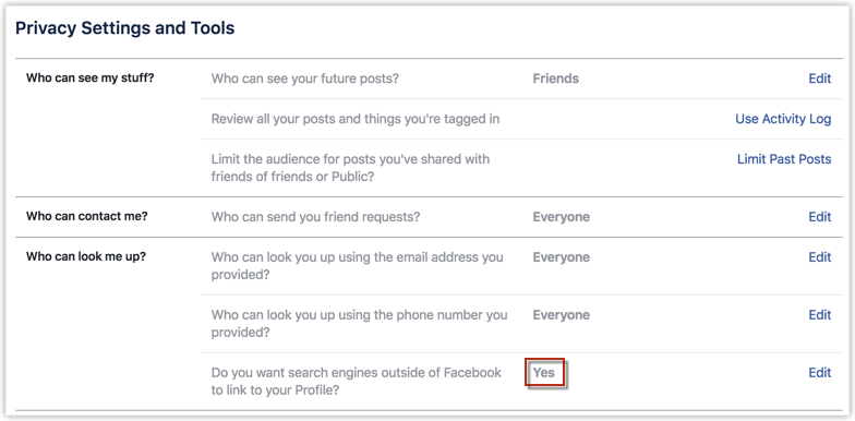 - Pentru Facebook, toate profilurile care se potrivesc și care au activat opțiunea "Dorești ca motoarele de căutare din afara Facebook să facă link către profilul tău?" în secțiunea "Privacy Settings and Tools", vor fi listate în rezultatele tale.
