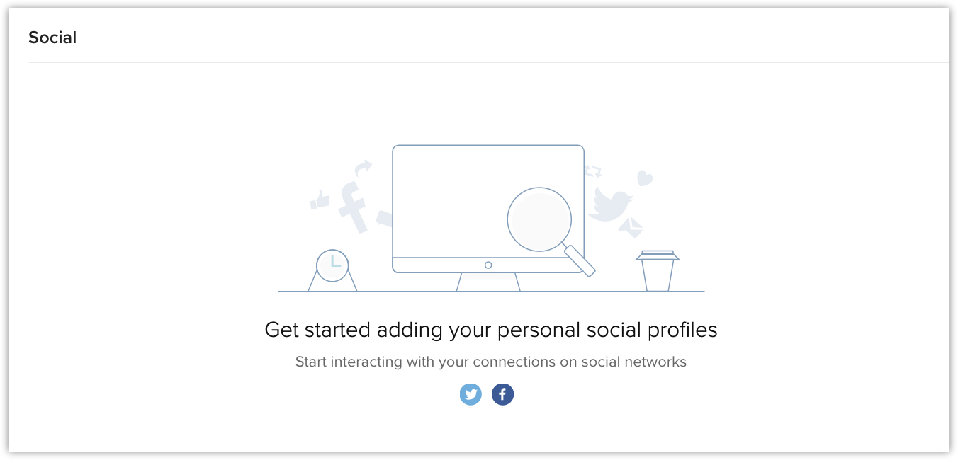 Lista asociată Social din paginile de detalii ale lead-urilor, contactelor și conturilor tale îți permite să asociezi profilurile lor de Twitter și Facebook cu CRM.