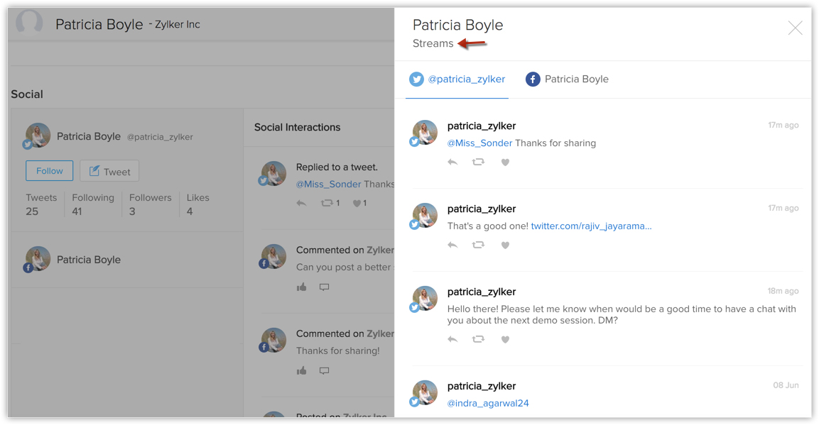 Fluxurile grupează cronologia Twitter și feed-ul lead-ului sau contactului.
