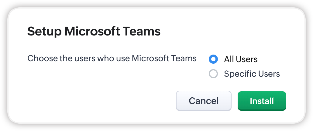 - În fereastra pop-up Configurare Microsoft Teams, alege utilizatorii cărora vrei să le oferi acces pentru a apela prin MS Teams. Poți modifica lista oricând ulterior. Fă clic pe Instalare din nou.