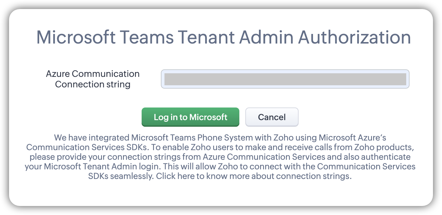 Notă: Integrarea va fi disponibilă pentru toți utilizatorii doar dacă administratorul alege Toți utilizatorii. - În următoarea fereastră pop-up, adaugă șirul de conexiune Azure Communication și fă clic pe Conectare la Microsoft.