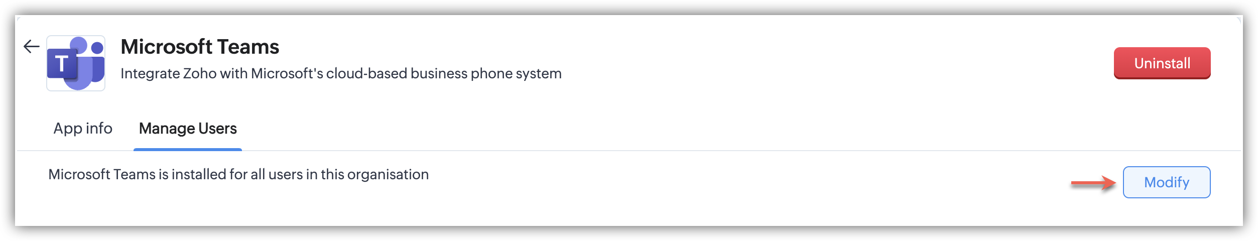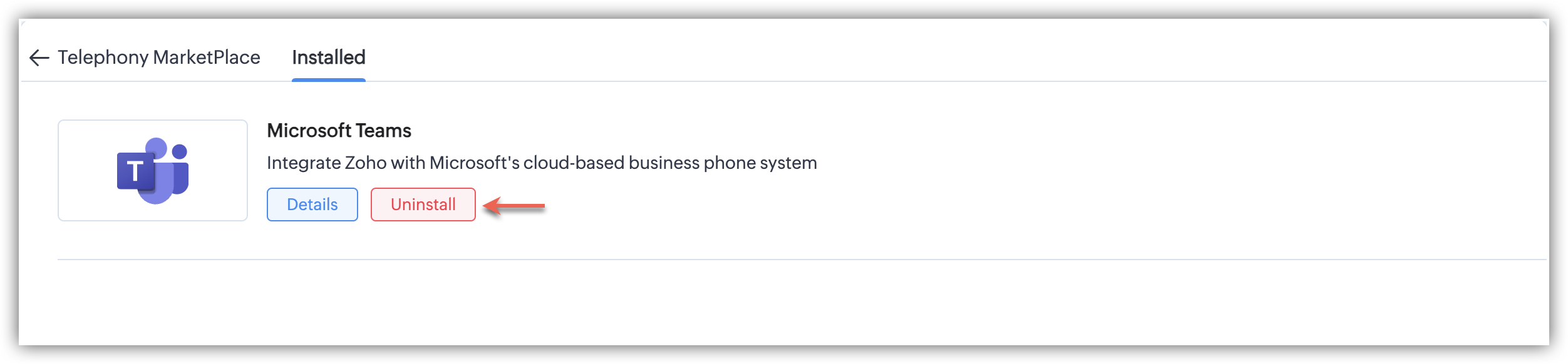 - Prin dezinstalarea MS Teams din Telefonie, nu vei mai putea efectua apeluri în Zoho CRM prin MS Teams.