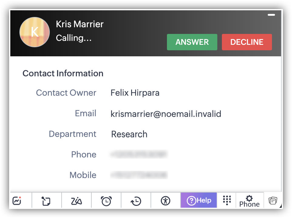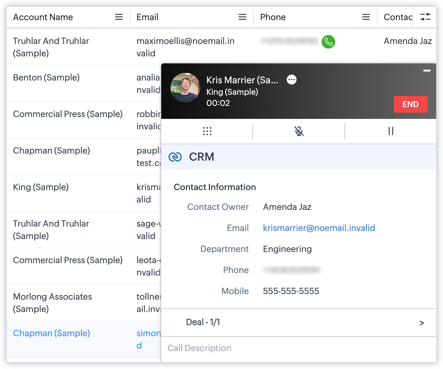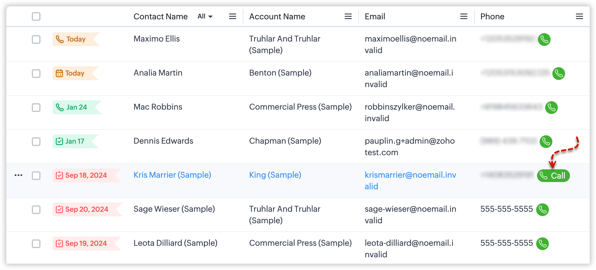 - Fă clic pe butonul Apelare al înregistrării dorite sub coloana de tip câmp Telefon pentru a efectua un apel.