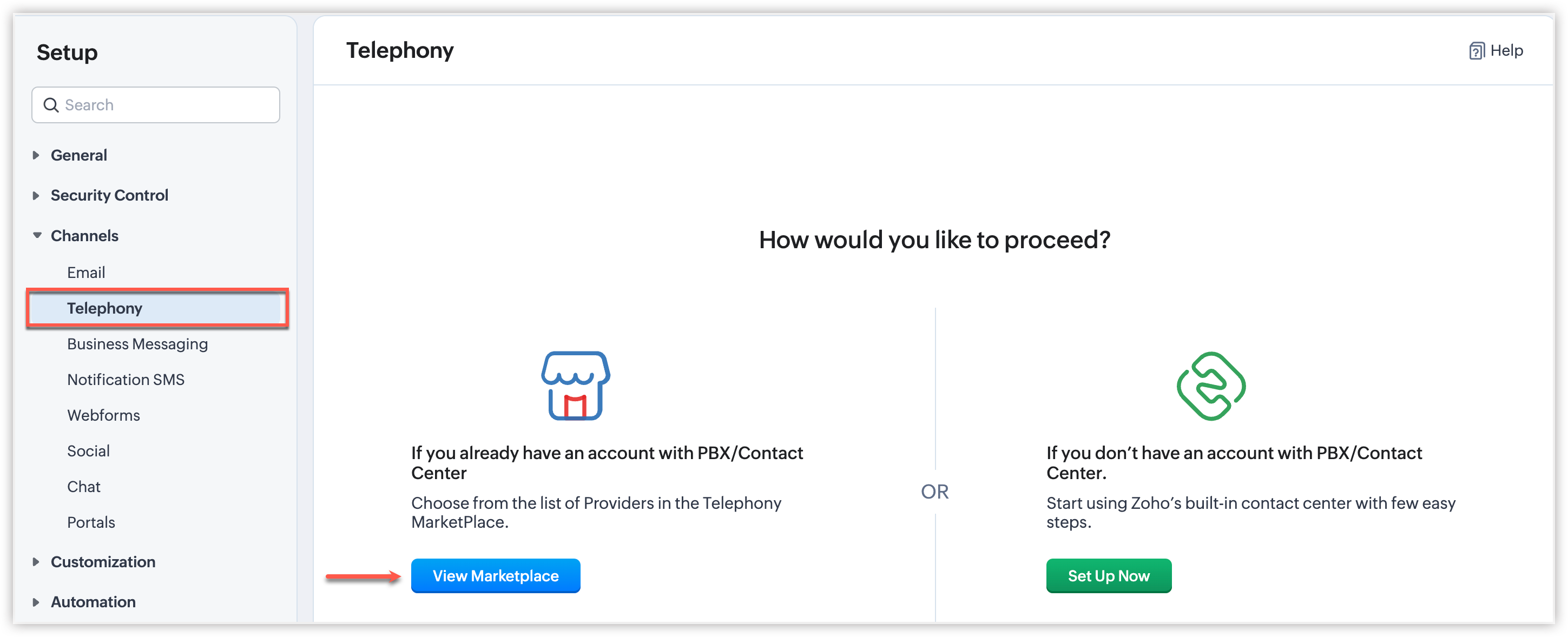 - Navighează la Configurare → Telefonie → Vizualizare Marketplace
