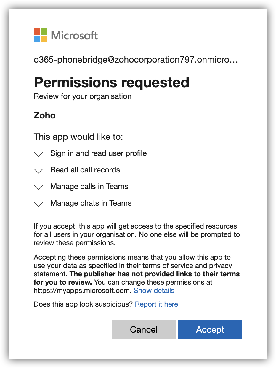 - API-urile MS Teams nu suportă funcționalitatea de apelare prin click din interfața Zoho și nici posibilitatea de a înregistra instantaneu apelurile efectuate din Zoho. Pentru a suporta acest lucru, trebuie să folosim SDK-ul Azure Communication Services pentru a accesa datele apelurilor telefonice MS Teams în numele tău și pentru a înregistra apelurile.
