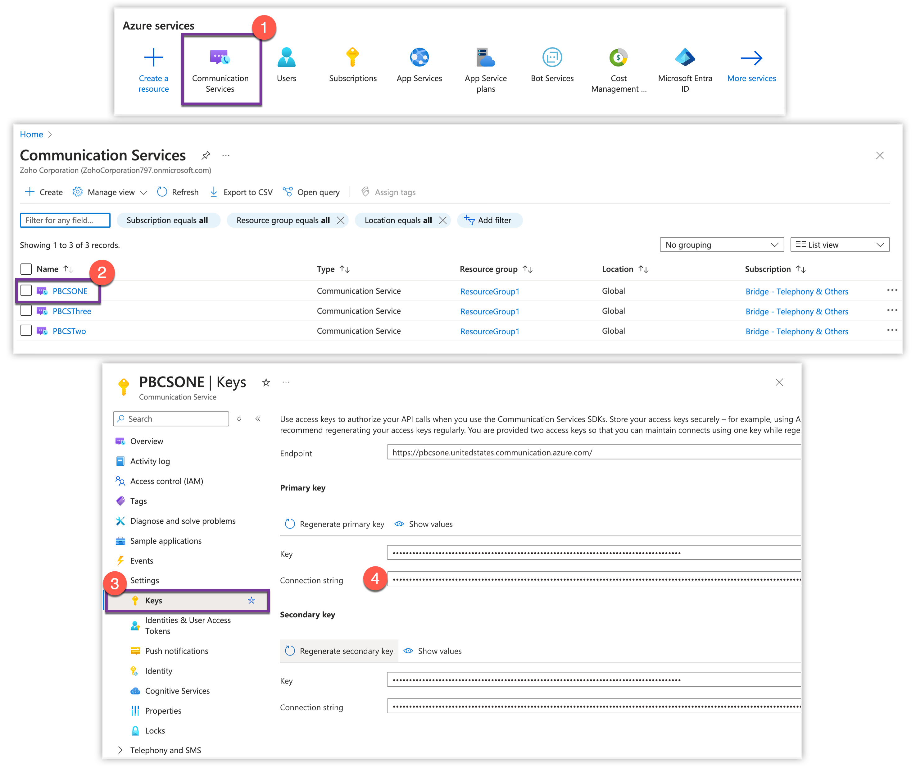 (Fă clic aici pentru a afla despre crearea și gestionarea resurselor Communication Services) - În panoul din stânga, fă clic pe Keys sub Settings.