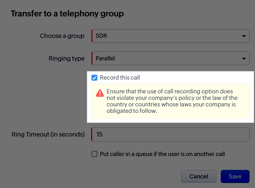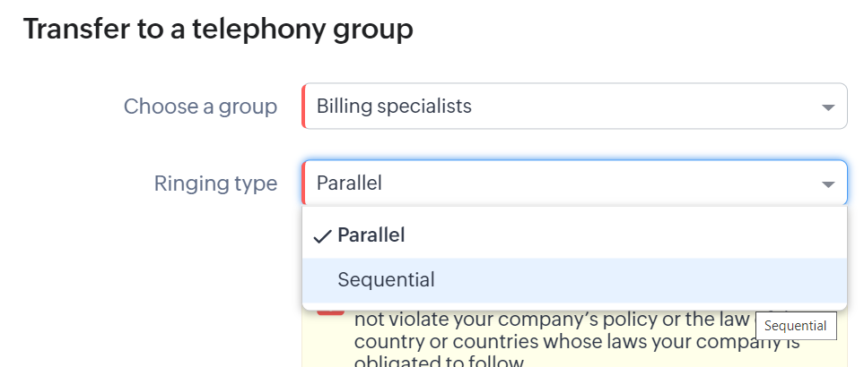 - Transfer către un grup de telefonie: Poți, de asemenea, direcționa apelurile către un grup de telefonie. În acest caz, ai opțiunile disponibile în starea Transfer către un utilizator plus capacitatea de a seta tipul de sonerie ca paralel sau secvențial. De exemplu, poți direcționa un apel legat de detalii de facturare către un grup de specialiști în facturare.