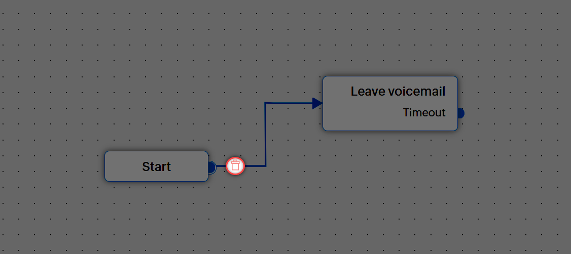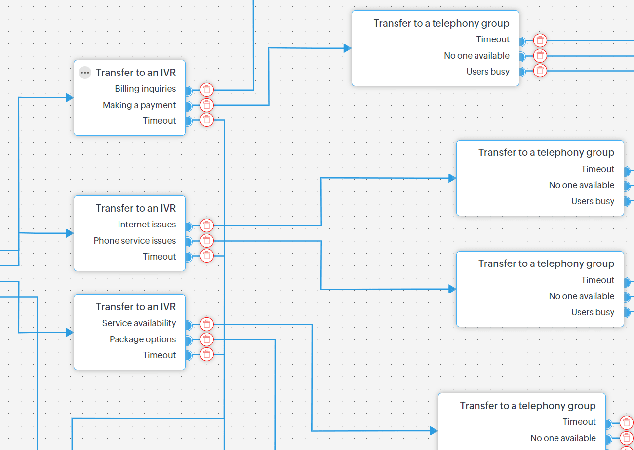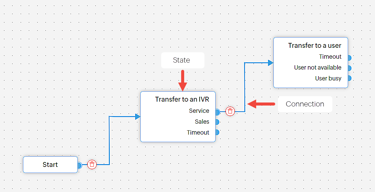 - Fiecare stare poate avea una sau mai multe conexiuni care pleacă din stare. Aceasta poate varia de la una în cazul stării Lasă mesaj vocal la unsprezece în cazul stării Transfer către IVR.