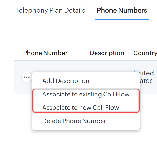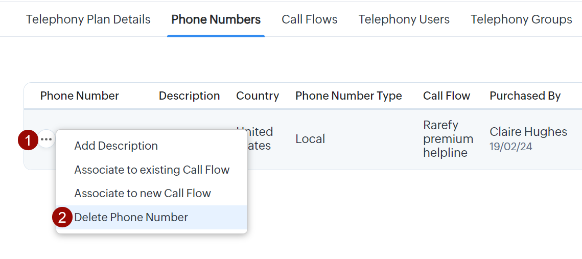 - Poți asocia un număr cu un flux de apeluri existent sau unul nou din tab-ul Numere de Telefon. Treci cu mouse-ul peste număr, apasă pe iconița Mai multe (...) și selectează opțiunea dorită.