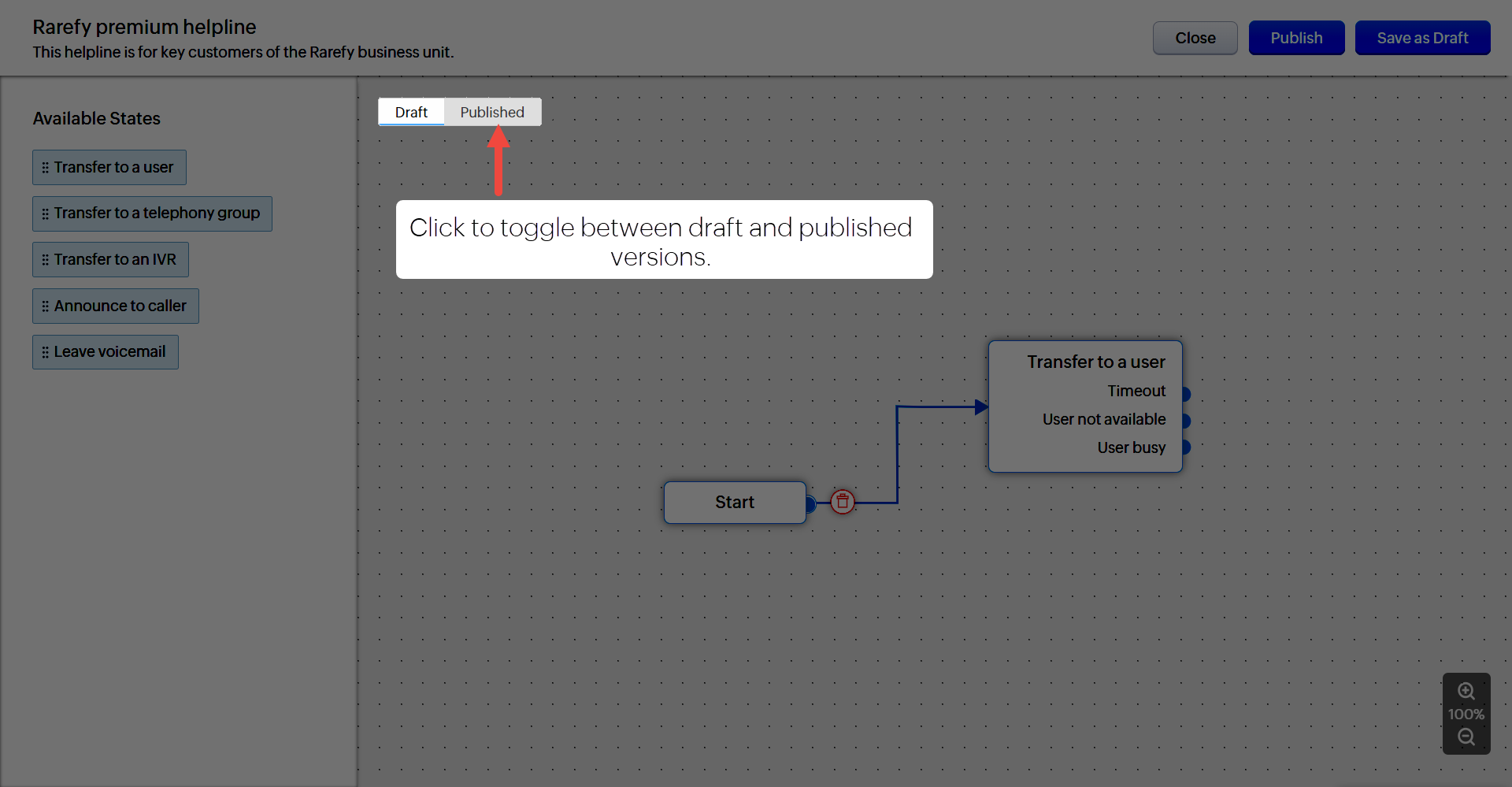 - Dacă ai publicat deja un flux, poți compara ciorna cu versiunea publicată selectând tab-urile respective în Constructorul de Fluxuri de Apeluri.