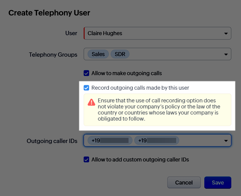 Notă: Dacă nu dorești să afișezi numărul de telefon în timpul unui apel de ieșire, poți masca numărul folosind un ID de apelant personalizat, astfel încât dacă prospectul sau clientul te sună înapoi, va fi redirecționat către numărul de suport dedicat. Când adaugi/editezi un utilizator de telefonie, vei putea activa aceasta pentru acel utilizator.Pentru a adăuga un utilizator de telefonie