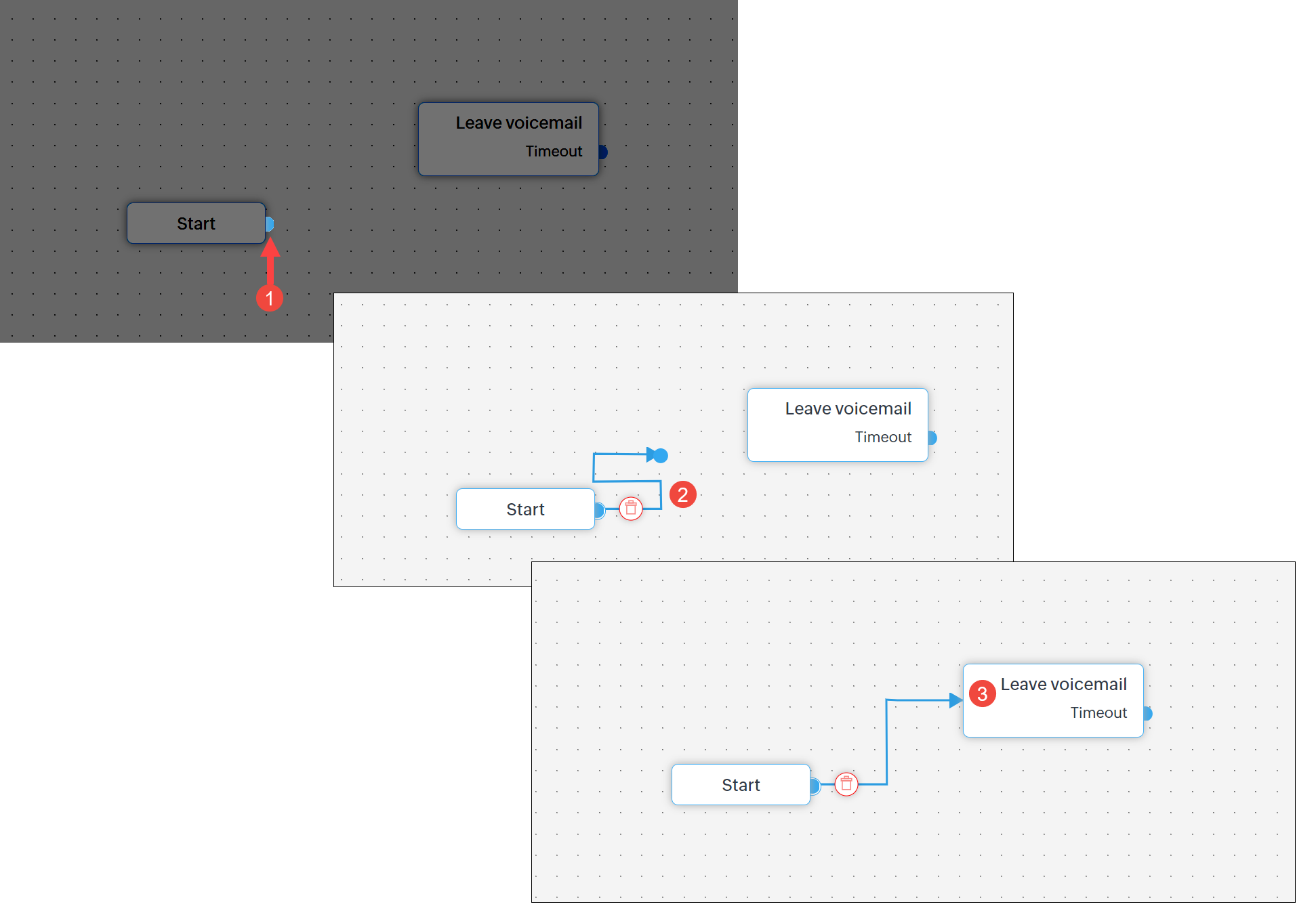 - Nu sunt permise bucle într-un flux de apeluri. Să spunem că un apel a trebuit să treacă prin trei stări pentru a ajunge la starea prezentă. Nu poți conecta starea prezentă la niciuna dintre acele trei stări.