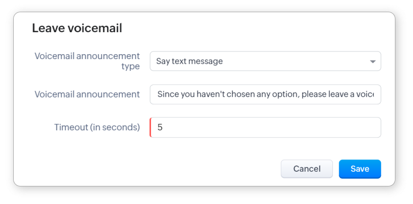 - Lasă mesaj vocal: Uneori, pur și simplu nu este posibil să răspunzi imediat tuturor clienților. În astfel de cazuri, poți cere apelantului să lase un mesaj vocal. Ca și opțiunile anterioare, poți introduce text, un fișier audio sau un URL audio pentru anunț. Poți, de asemenea, seta timeout-ul pentru această stare.