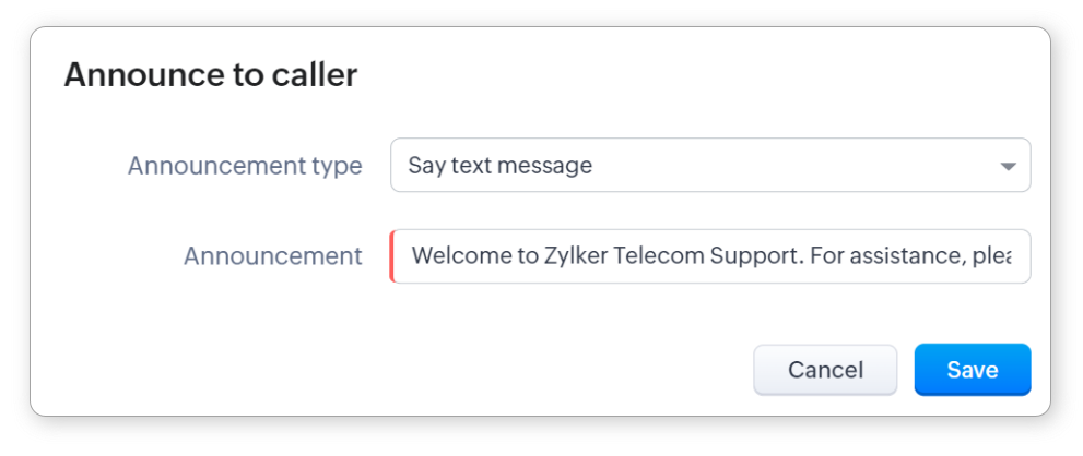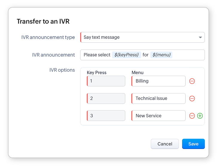 - Transfer către un IVR: IVR (Răspuns Vocal Interactiv) este un sistem de răspuns operat de computer care va interacționa cu apelanții și va direcționa apelul lor pe baza opțiunilor pe care le fac. Poți decide dacă anunțul ar trebui să fie citirea unui mesaj text, un fișier audio sau un URL audio.